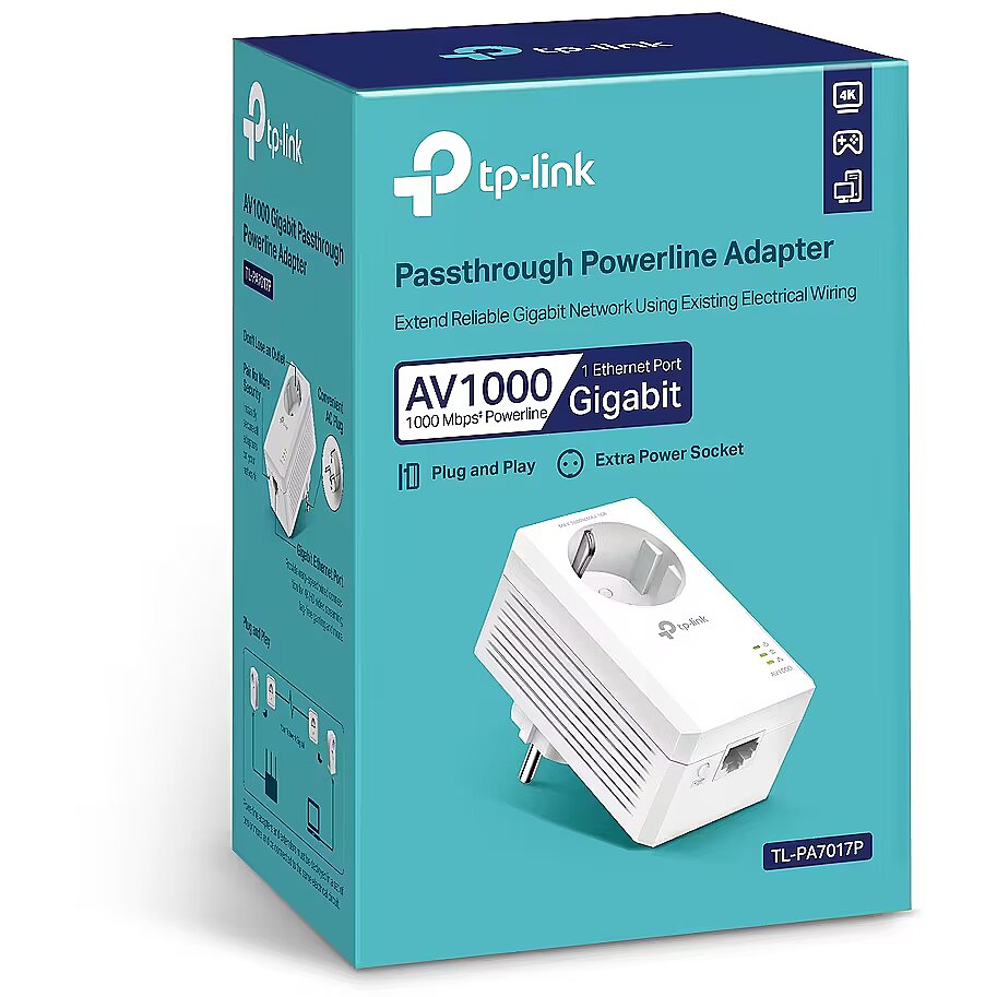 description_lv - TP-Link AV1000 Gigabit Passthrough Powerline adapteris TL-PA7017P ir praktisks risinājums, kas ļauj izveidot ātru un stabilu tīkla savienojumu, izmantojot esošo elektroinstalāciju - bez gariem kabeļiem. Pateicoties HomePlug AV2 tehnoloģijai, varat sasniegt datu pārraides ātrumu līdz pat 1000 Mb/s, kas ir piemērots 4K straumēšanai, tiešsaistes spēlēm un lielu failu pārsūtīšanai. Ierīcei ir Gigabit Ethernet ports, maiņstrāvas kontaktligzda un drošs savienojums ar 128 bitu AES šifrēšanu. Komplektācijā ietilpst viens adapteris, kas ir ideāli piemērots esošā Powerline komplekta paplašināšanai. Lai izveidotu savienojumu, ir nepieciešami vismaz divi saderīgi adapteri. Līdz 1000 Mb/s datu pārraides ātrums - HomePlug AV2 tehnoloģija ātrai un uzticamai datu pārraidei Gigabit Ethernet savienojums - ātrs un stabils vadu savienojums ar ierīcēm Maiņstrāvas pieslēgvieta ļauj izmantot strāvas kontaktligzdu citām ierīcēm Plug-and-play uzstādīšana - gatavs lietošanai bez sarežģītas iestatīšanas Energoefektīvs - automātiskais enerģijas taupīšanas režīms samazina patēriņu līdz pat 85 % Drošs savienojums - 128 bitu AES šifrēšana un vienkārša savienošana ar vienu pogu Līdz 300 m savienojuma attālums pa elektrības vadu Komplektā iekļauts - viens TL-PA7017P adapteris un viens Ethernet kabelis
