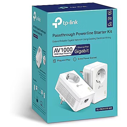 Technical_details - The TP-Link TL-PA7019P KIT is a Gigabit Powerline Starter Kit that brings Internet into the home network via any socket using electrical wiring. The powerline adapters and extenders must be installed in a set of two or more and connected to the same circuit. The TP-Link TL-PA7019P KIT ensures fast powerline speeds - it is HomePlug AV2 standard compliant and high data transfer rates of up to 1000 Mbit/s are ideal for Ultra HD streaming and online gaming. The Gigabit Ethernet port provides reliable, fast cable connections for game consoles, smart TVs, set-top boxes and more. The integrated sockets ensure that no socket for other devices is lost. Item no.: 100017086 Powerline type EAN 6935364010959 Manufacturer no. TL-PA7019P KIT(DE) Socket design Area of application: home networks Network RJ-45 connections 1x (of which: 1x 10/100/1000) More LEDs Powerline Powerline number of adapters 2 pieces. LEDs Activity, Power Reset/Pair control buttons Power supply power consumption operation: 3.26 W Feature Up to 300m range Accessories available: 2x RJ-45 Ethernet cables, quick installation instructions Dimensions Width: 52mm x Height: 65mm x Depth/Length: 28.5mm