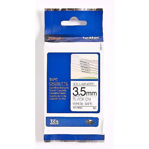 LongSummaryDescription - Brother TZE-N201. Tape type: TZ, Country of origin: China, Spare part retention: 5 year(s). Tape width: 3.5 mm, Tape length: 8 m, Width: 18 mm. Pallet gross height: 16.2 cm, Master (outer) cases per pallet: 36 pc(s), Layers per pallet: 6 pc(s). Tape size: 3.5 mm