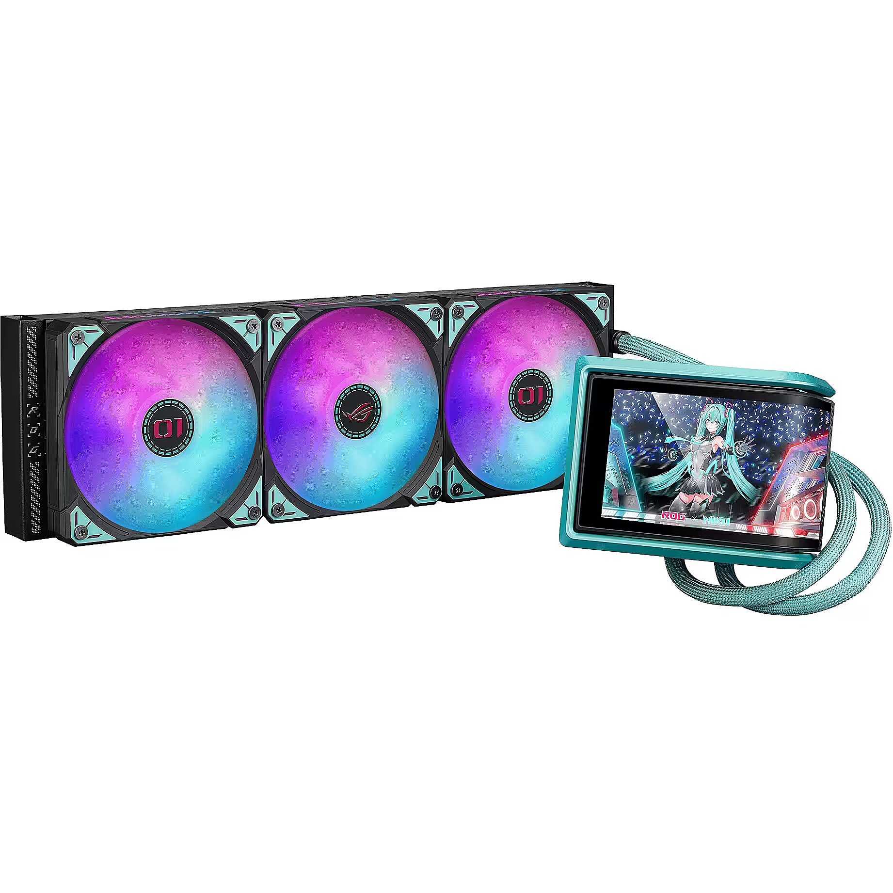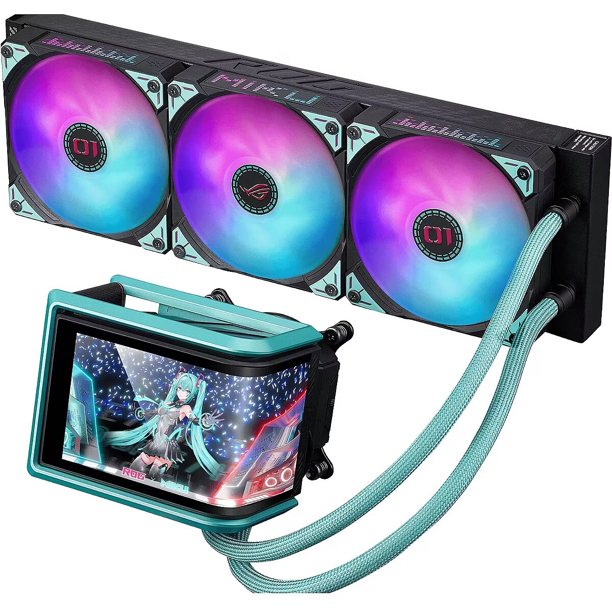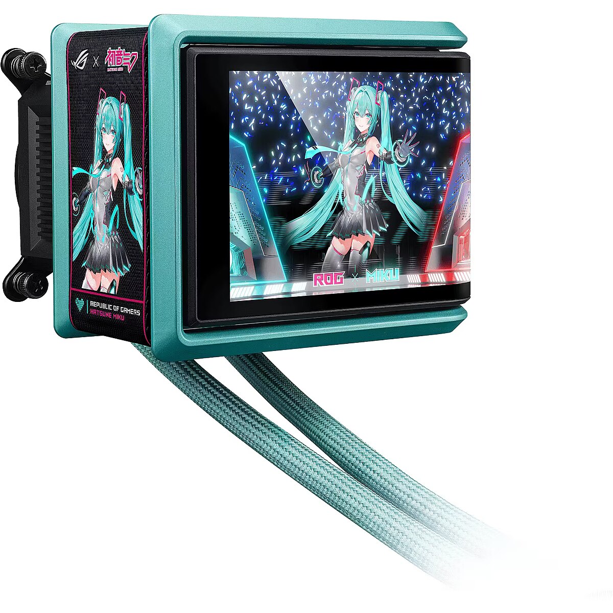 LongDesc - Feel the Beat, In-Game FeatsROG continues its collaboration with virtual pop star Hatsune Miku with a complete gaming system centered around ROG's sci-fi aesthetics and Miku's signature blue-green, pink-color scheme. The collection combines Hatsune Miku’s signature style with superior ROG performance, premium quality, and versatile functionality for competitive gameplay or daily tasks. Products include a motherboard, graphics card, PC case, all-in-one cooler, SSD enclosure, power supply, monitor, and apparels, enabling gamers to create an entire gaming setup that exudes the vibrant Miku aesthetic.HATSUNE MIKU EDITIONROG Ryuo IV 360 ARGB Hatsune Miku Edition features a 6.67-inch AMOLED display, enabling intuitive control through dedicated software to smoothly display 3D videos, customized content, or hardware information. The innovative curved-screen design breaks the boundaries between the virtual and the real. The powerful pump and ROG ARGB fans provide stable cooling performance for CPUs, including the AMD Ryzen™ 9000 series and Intel® Core™ Ultra processors.Extraordinary VisualThe 6.67-inch 2K AMOLED curved screen features a high-resolution, vibrant color display that provides the ultimate immersive visual experience.Pre-Installed High-Performance FansThe ROG RYUO IV MF-12C ARGB Fan delivers strong and stable airflow, significantly enhancing the cooling capabilities of your system. With pre-installed, daisy-chained ARGB fans, the installation process is streamlined, allowing for a hassle-free setup while maintaining optimal performance.ASUS INFOHUBThe ASUS InfoHub lets you easily add any custom content, including images, GIFs, and videos.
