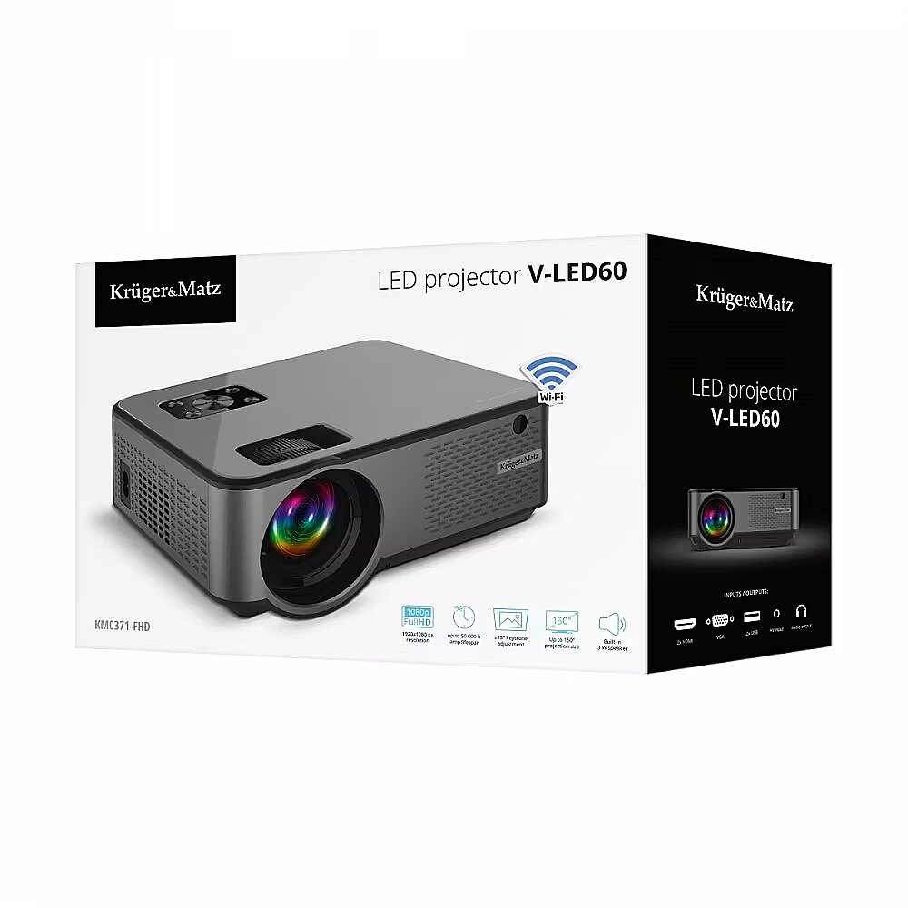 Description - LED projector for home Are you trying to decide which projector to choose for your home? Be sure to check out the Kruger&Matz V-LED60 LED projector! The device plays materials in full HD resolution, so it is ideal for displaying your favorite programs and movies. Projector with Wi-Fi The biggest advantage of the Kruger&Matz V-LED60 is Wi-Fi connectivity, which will replace some functions of a smart TV. Now you can not only send movies and images saved on your phone or computer, but also display online materials from streaming platforms, e.g. Netflix or YouTube using these devices. And all this without connecting additional cables! Wide range of projection sizes Do you think that a 65-inch TV is a lot? The Kruger&Matz V-LED60 projector allows you to display images with a diagonal of up to 150. That's almost twice as much! Now, every time you watch a movie, you can feel like you're in a movie theater. Keystone adjustment knob The Kruger&Matz multimedia projector is equipped with two knobs that allow you to conveniently adjust the image settings to your requirements. The first one allows you to manually adjust the focus, while the second one allows you to correct trapezoidal distortions. Long lamp life When choosing an LED projector, pay attention to the lamp life. The one in the Kruger&Matz V-LED60 projector will last up to 50,000 hours, which gives you over 5 years of continuous viewing. Enjoy a device that will serve you for years. Inputs and outputs in the projector The Kruger&Matz V-LED60 projector gives you a wide range of possibilities when it comes to choosing the playback source. You have a number of ports at your disposal: HDMI, USB, VGA port and AV input. Thanks to them, you can connect a digital decoder, pendrive, laptop or even smartphone. Additionally, the AUX output allows you to connect a set of speakers. Projector with built-in speaker Don't want to connect additional speakers? The Kruger&Matz V-LED60 projector is equipped with a speaker with 5 sound modes and manual balance adjustment. Decide for yourself which option suits you better. Remote control The Kruger&Matz V-LED60 projector is also convenient to use. The set includes a remote control, thanks to which you can, for example, select the playback source or adjust the volume without getting up from the couch. Tripod-mounted projector No space on a shelf or table? No problem! On the bottom of the Kruger&Matz V-LED60 projector you will find two threads that allow you to mount the projector to a tripod or holder. Projector bag Do you often travel and want your projector to be protected while traveling? Kruger&Matz offers a bag dedicated to V-LED series models. This extremely practical and functional accessory will provide protection and ease of transport for your LED projector.