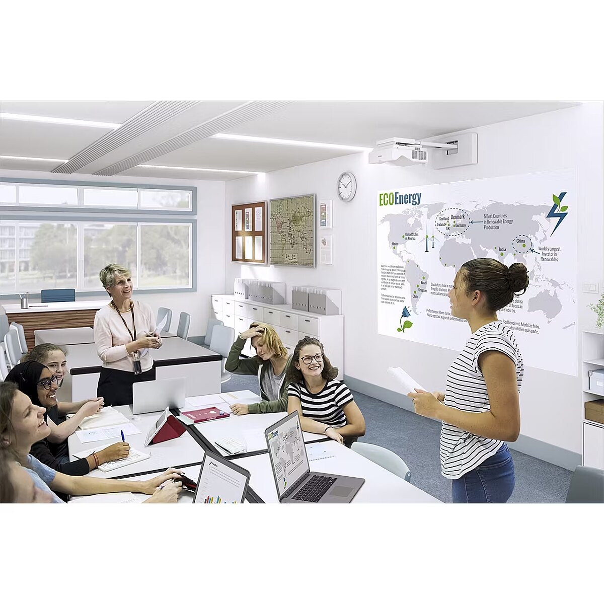 LongDesc - The EB-760Wi is a step up from the EB-760W, with added interactive features.Interactive technology enables two digital pens to be used simultaneously on the display (finger touch available through optional accessory FT01). Presentations can be controlled and brought to life with on-screen annotations, while a variety of convenient built-in tools support productivity. An optional Epson visualiser camera can be controlled via the display, projecting documents or objects from a desk for everyone to see in incredible HD detail.The ultra short throw lens allows safe, discreet positioning above the display, enabling presenters free access to interact without casting shadows.With a 4,100 lumens laser-light source, combined with 3LCD technology, it produces a large, bright and vibrant display up to 100", visibly clear from all angles and at a distance.Versatile wired and wireless connectivity options, including screen mirroring via Miracast™, allow participants to effortlessly share content from their PCs or mobile devices.Unlike a flat-panel display, there is no heavy, breakable, glass panel to create disruptive, reflected blind spots from certain angles, and presenters are not subjected to LCD panel direct blue light radiation, believed to damage eyes.