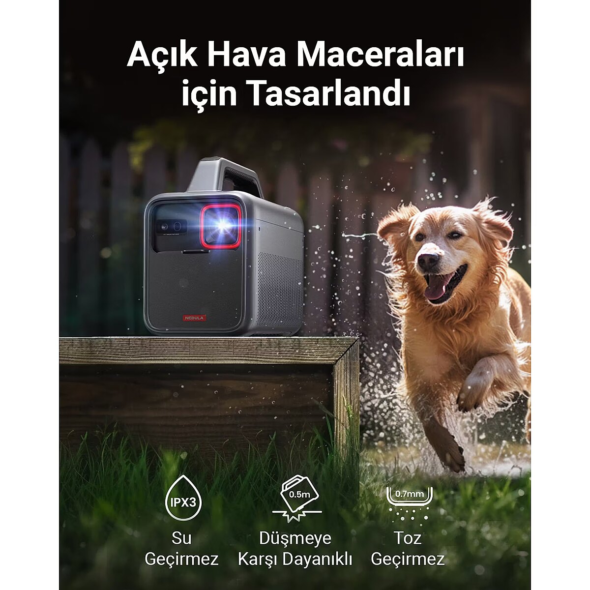 LongDesc - Iedvesmojošs āra filmu projektors: Pateicoties 1000 ANSI lūmenu spilgtumam, maksimālajam ekrāna izmēram 200 collas un 1080p izšķirtspējai, jūs varat baudīt kinoteātra līmeņa kino pieredzi jebkurā vietā. Turklāt mūsu jaudīgais mākslīgais intelekts automātiski pielāgo ekrāna spilgtumu, lai nodrošinātu vislabāko iespējamo skatīšanās pieredzi. Saderīgs ar Android TV 11.0, lai paplašinātu izklaides iespējas ar vairāk nekā 400 000 filmu un raidījumu un vairāk nekā 7000 lietotņu. Strādā arī ar Chromecast un Google, lai padarītu jūsu kino vakaru vieglāku nekā jebkad agrāk.Izbaudiet 5 stundu atskaņošanas laiku jebkurā vietā: Mūsu ekskluzīvā RoamPower™️ tehnoloģija; atbalsta 185Wh ietilpību, kas ļauj izmantot Mars 3 kā enerģijas banku, lai uzlādētu viedierīces, baudītu 5 stundas filmu un 15 stundas klausītos iecienītākās melodijas.Paredzēts darbam brīvā dabā: Ar IPX3 ūdensizturību, 0,5 m izturību pret kritieniem, 0,7 mm izturību pret putekļiem, iebūvētu statīvu, objektīva vāciņu, kempinga apgaismojumu, strāvas indikatoru, integrētām vadības ierīcēm un rokturi pārnēsāšanai, jūs varat turpināt skatīties, lai arī ko jums sagādātu lielais ārā.Krāsains un aizraujošs audio: Iebūvētais 40 W skaļrunis ar Dolby Digital Plus nodrošina skaidru un aizraujošu āra skaņu, lai filmas skanētu pārsteidzoši, bet mūzika skanētu skaidri un tīri ar līdz pat 15 stundu ilgu mūzikas atskaņošanu.Laiga uzstādīšana sekundes laikā: Pateicoties inteliģentai vides pielāgošanai, iebūvētais inteliģentais sensors veic autofokusu, trapeces korekciju un ekrāna pielāgošanu tikai 3 sekundēs, padarot iestatīšanu pavisam vienkāršu.Ko jūs saņemat: Nebula Mars 3 projektors, tālvadības pults, strāvas adapteris, barošanas vads, 2x AAA baterijas, ātras lietošanas rokasgrāmata.