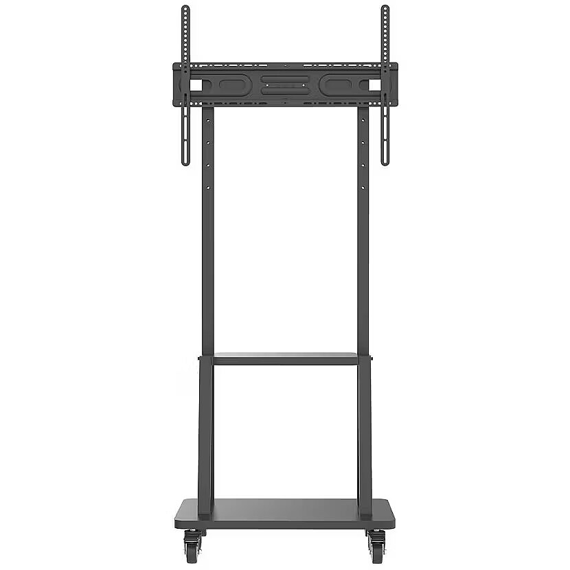 Apraksts - Grīdas statīvs LCD/plazmas ekrānu ar diagonāli 32-70" montāžai. VESA atbalsts: maksimāli 600x400; maksimālā slodze: 70 kg. TV statīvs uz taisnstūrveida pamatnes ar riteņiem (702x430 mm), no kuriem divi ir aprīkoti ar bremzēm lielākai stabilitātei. TV statīvs regulējams 2 pozīcijās; kopējais ratiņu augstums: 1800 mm. Integrēts aprīkojuma plaukts (485x280 mm); ratiņu krāsa: melna.
