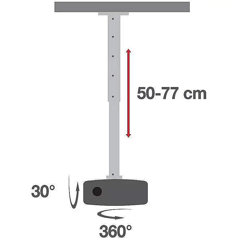 Apraksts - Rokturis projektoram 50-77 cm pie griestiem, 15 kg - Nodrošina drošu montāžu pie griestiem lielākajai daļai projektoru tipu - Izgatavots no izturīga alumīnija un tērauda maksimālai drošībai - Universāla montāžas plāksne lietošanai ar lielāko daļu projektoru - Regulējams garums - Iespēja regulēt slīpuma leņķi - Iespēja regulēt rotāciju horizontālā plaknē - Integrēta kabeļu vadības sistēma - Ideāli piemērots lietošanai mājās, birojā un komerciālos nolūkos