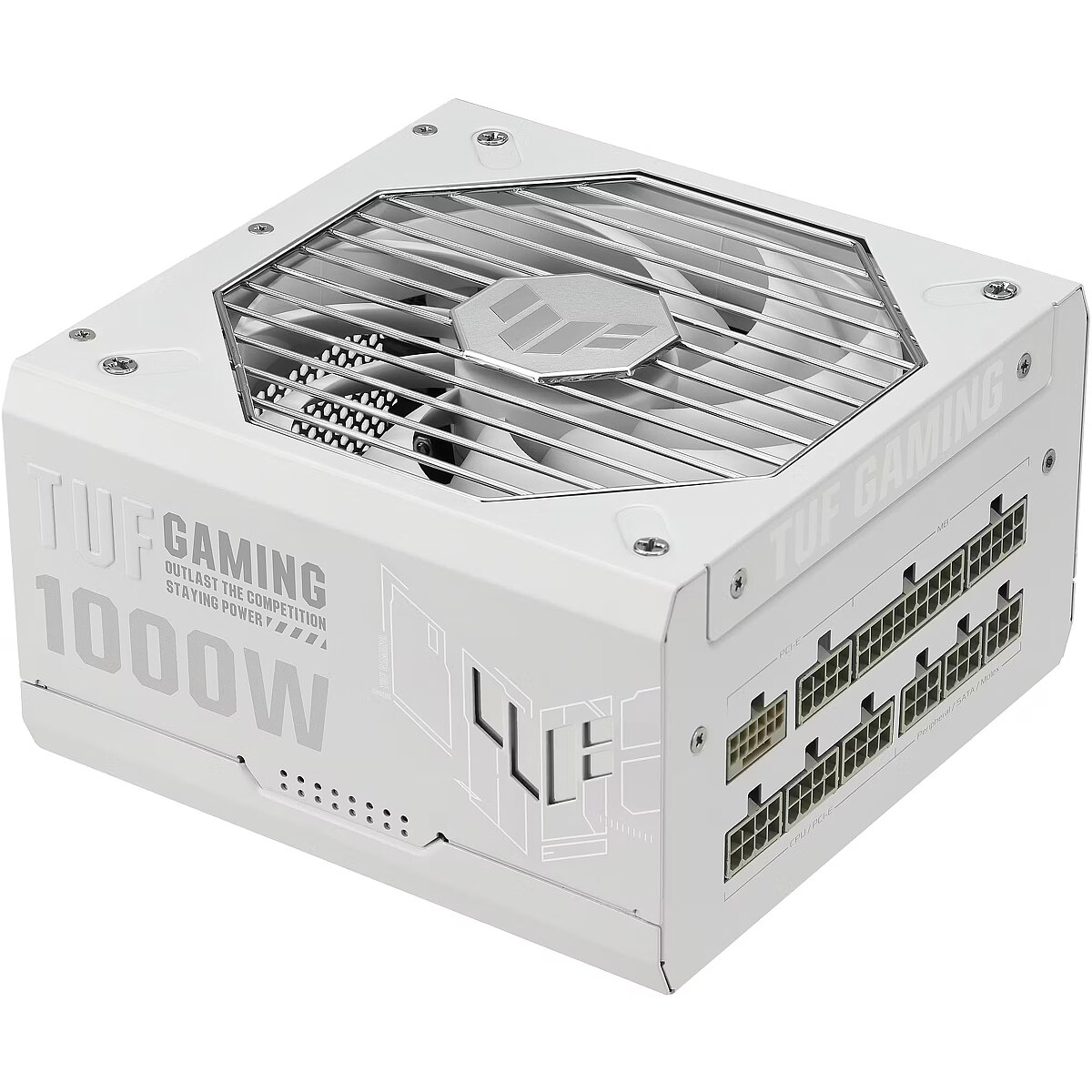 LongDesc - Built For The Long HaulThe ASUS TUF Gaming 1000W Gold White Edition packs military-grade strength, a flagship fan design, and PCB protection for efficient, durable power delivery. The result is a PSU that will reliably fuel your rig for years to come.DurabilityTUF ComponentsTop marksWith military-grade components, including capacitors rated for 105°C operation and up to 170,000 hours' lifespan, the ASUS TUF Gaming 1000W Gold White Edition empowers you to build in confidence.Dual Ball Fan Bearings2x longer lifespanExemplary cooling is provided by a 135mm fan spinning on a dual ball bearing setup that will last up to twice as long as a sleeve bearing design.Protective PCB CoatingAll wrapped upA protective conformal coating envelops the PCB to protect against short-circuits caused by moisture, dust, and debris.ENGINEERING80 Plus Gold CertificationHeart of goldThe TUF Gaming 1000W Gold White Edition features efficient, low-ESR Japanese capacitors to ensure efficient operation — affording it 80 PLUS® Gold status. This means it delivers up to 92% efficiency, resulting in less heat, reduced fan noise, and increased reliability.ATX 3.1 CompatibleStep into the futureThe latest power specification updates have landed. ATX 3.1 ushers in tighter voltage and current regulation guidelines for next-gen hardware - and TUF Gaming 1000W Gold White Edition steps ahead of the curve by being fully compliant. A 16-pin PCIe cable ripe for piping up to 600W of power to PCIe Gen 5.0 graphics cards is bundled with the PSU, bringing large-scale capabilities.Axial-tech Fan DesignBetter, faster, strongerAxial-tech fan design features a smaller fan hub that facilitates longer blades and a barrier ring that increases downward air pressure. For TUF Gaming series PSUs, we've scaled that design to 135mm so it keeps things cool at low RPMs while producing less noise.EXPERIENCE10-year WarrantyA decade of powerWe're so confident about the reliability of the TUF Gaming 1000W Gold White Edition that we back it with a 10-year warranty.Fully Modular Etched CablesSupple plyThe included fully-modular cable set is etched to provide a similar aesthetic to sleeved cables but a touch more flexibility for tight spaces.