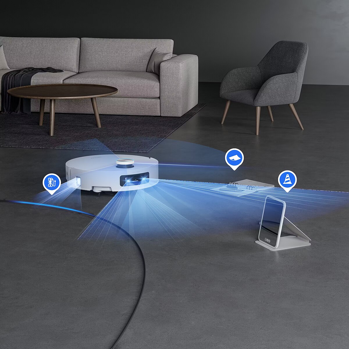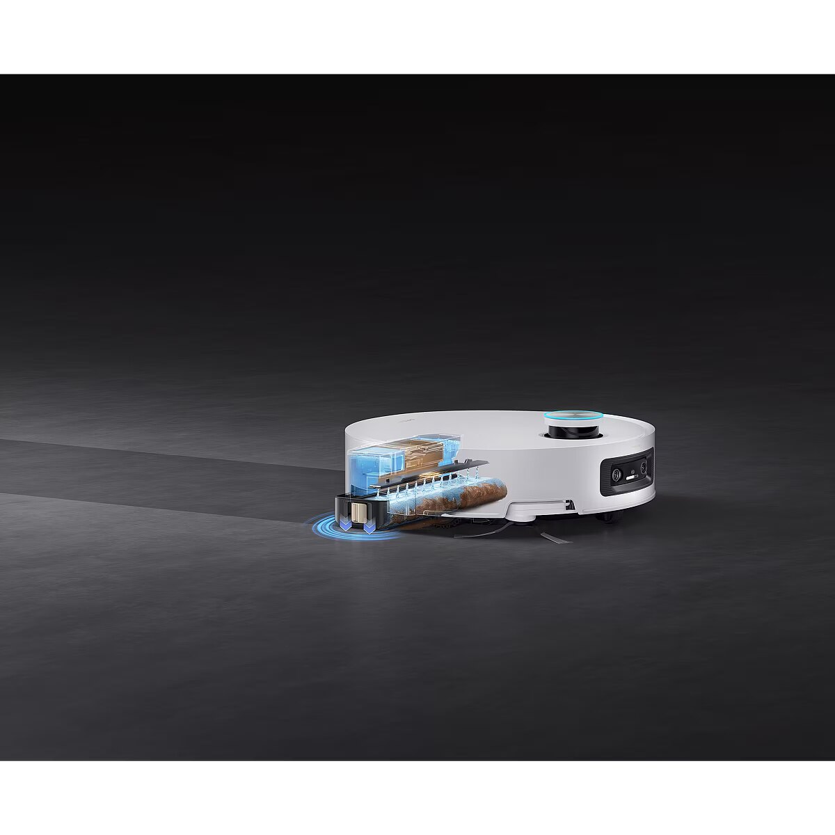 The robot delivers up to 25.000 Pa of suction power, effectively collecting dirt, paper scraps, hair, and pet litter from various surfaces. The suction power can be easily adjusted via the app. Package contents