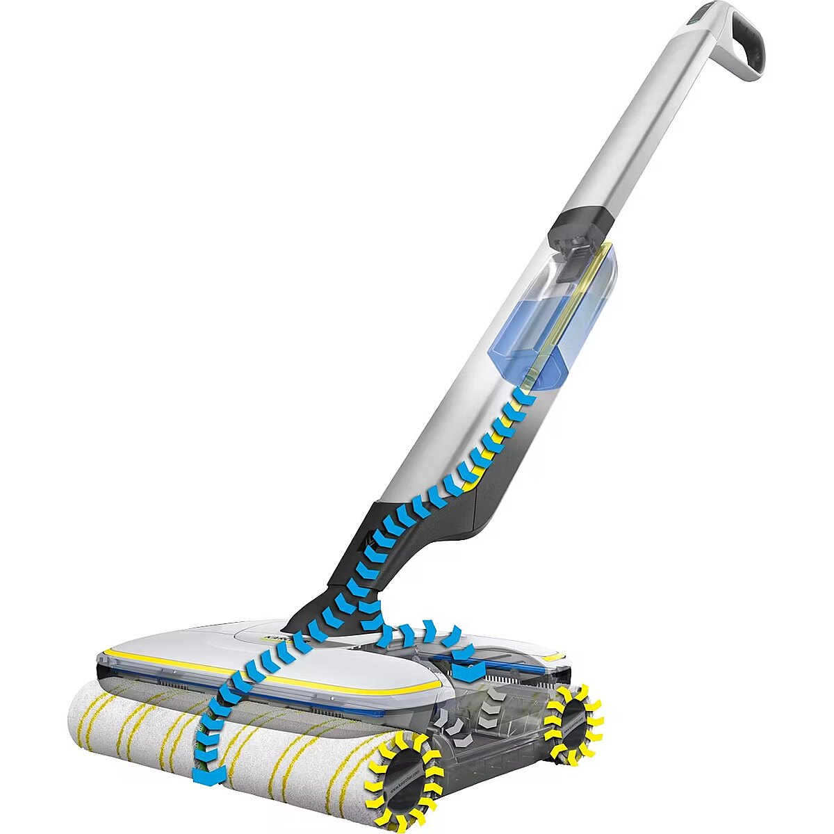 Apraksts - Elektriskā mopa FC 7 Bezvadu elektriskā mopa FC 7 ar vienu kustību savāc ikdienas mitros un sausos netīrumus. Pirms slaucīšanas vairs nav nepieciešams putekļusūcējs, ietaupot pusi laika**. Četru kustīgo spilventiņu tehnoloģija nodrošina ātru un efektīvu slaucīšanu un maigu slīdēšanu pa grīdu. Spilventiņi efektīvi savāc arī mājdzīvnieku matus. Grīdas ir par 20 % tīrākas salīdzinājumā ar tradicionālo mopu* līdz pat malām. Nepieciešamība izmantot spaini ir pagātne, jo mašīnai ir rezervuārs gan tīram, gan netīram ūdenim. Nav arī nepieciešams pieskarties netīrajām daļām, jo spilventiņi tiek pastāvīgi samitrināti ar tīru ūdeni, bet netīrais ūdens nonāk tieši atsevišķā tvertnē. Pievadītā ūdens daudzumu un spilventiņu darbības ātrumu var regulēt divos līmeņos, lai pielāgotu grīdas tipam. Ir pieejama arī funkcija Boost, kas ļauj notīrīt pat noturīgus netīrumus. Akumulatora darbības laiks ir 45 minūtes, kas ļauj tīrīt līdz 135 m lielu platību. Iekārta ir ideāli piemērota visiem cietās grīdas veidiem (akmensmasas, parketa, lamināta grīdas segums, PVC, vinila segums).