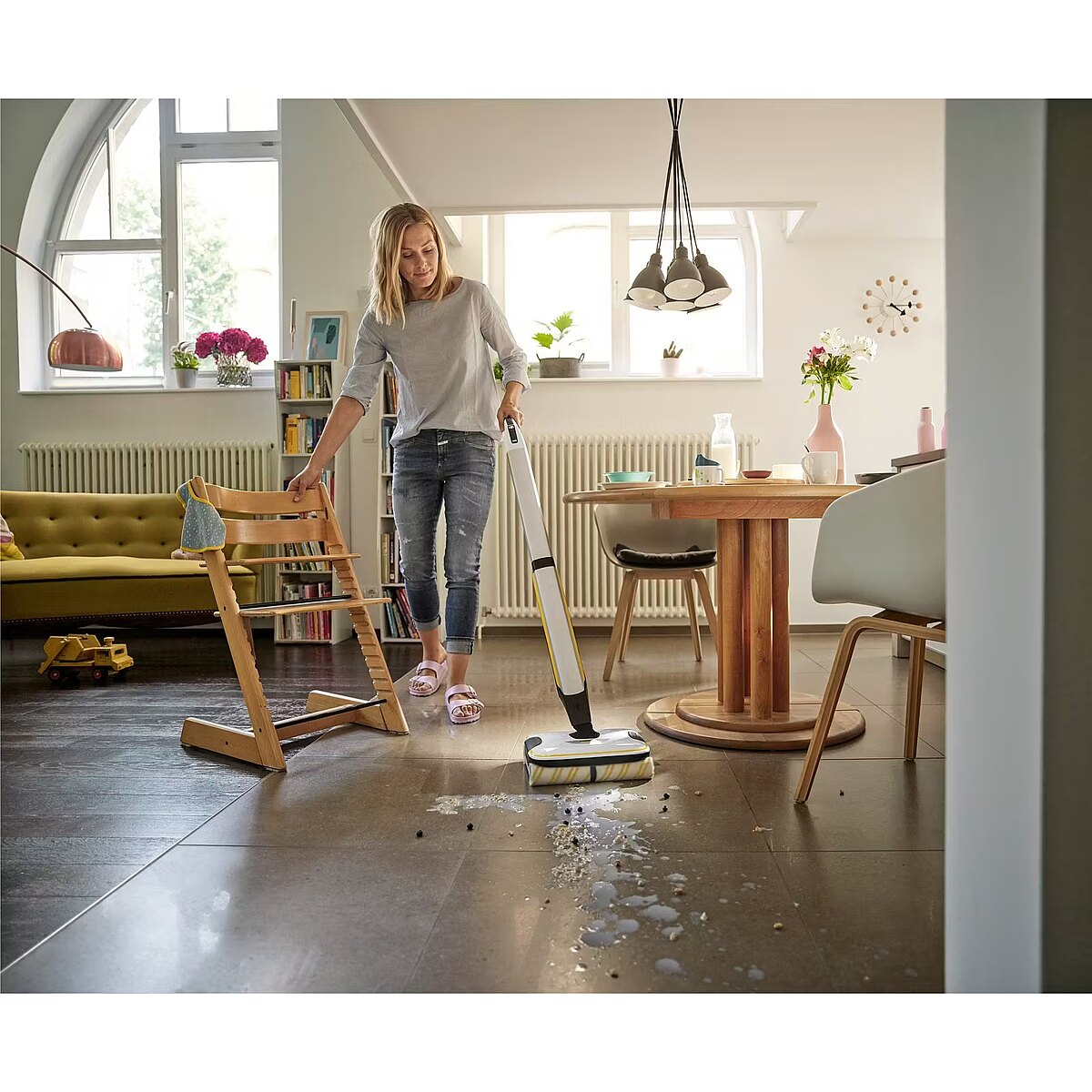 Description - Electric mop FC 7 Cordless The cordless electric mop FC 7 picks up everyday wet and dry dirt in one movement. There is no longer any need to vacuum before mopping, saving half the time**. The technology of the four movable pads allows for fast and effective mopping and gentle gliding across the floor. The pads also effectively pick up pet hair. Floors are 20% cleaner compared to a traditional mop* right up to the edge. The need to use a bucket has become a thing of the past, as the machine has a reservoir for both clean and dirty water. There is also no need to touch the dirty parts, as the pads are constantly moistened with clean water, while the dirty water goes straight into a separate tank. The amount of water fed and the speed of the pads can be adjusted at two levels to suit the type of floor. A Boost function is also available to remove even stubborn dirt. The battery has a run time of 45 minutes, allowing you to clean an area of up to 135m. The machine is perfect for all hard floor types (stoneware, parquet, laminate flooring, PVC, vinyl).