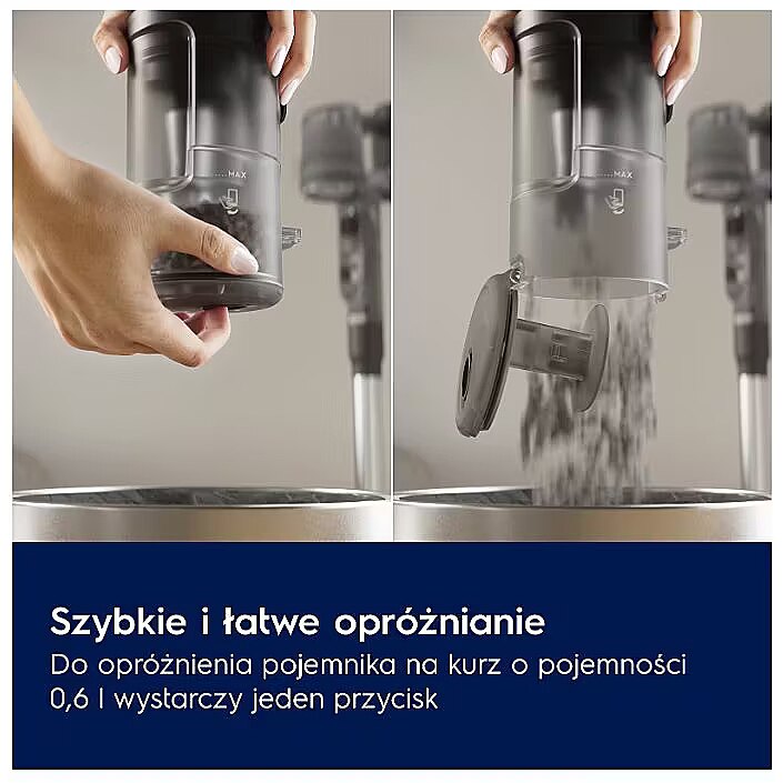 Mając do dyspozycji nawet 50 minut nieprzerwanego odkurzania* przy użyciu uchwytu ręcznego, możesz oczyścić więcej powierzchni za jednym razem. Sześcioogniwowa bateria wysokiej jakości zapewnia nieprzerwane czyszczenie wszystkich powierzchni. *Na podstawie wewnętrznych testów zgodnie z IEC 62885-4 z pomiarem czasu pracy przy użyciu uchwytu ręcznego w trybie minimalnym. Szybkie opróżnianie pojemnika na kurz bez kontaktu z kurzem