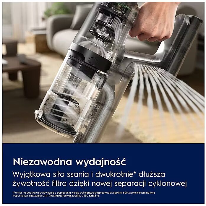 Ulepszony separator cykliczny minimalizuje ryzyko zatkania filtra, zapewniając stałą optymalną wydajność. Do 2 razy* dłuższe działanie na jednym filtrze. *Pomiar na podstawie porównania z poprzednim odkurzaczem bezprzewodowym 600 z pojemnikiem na kurz wypełnionym mieszanką DMT (test standardowy) zgodnie z IEC 62885-4 Maksymalnie 50 minut czyszczenia po jednym naładowaniu