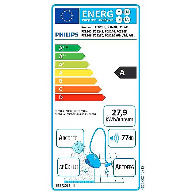 Apraksts - PowerGo FC8240 / 09 putekļsūcējs Augsta efektivitāte ar 3AAA enerģijas klasi Putekļsūcējs, kas izstrādāts, lai sasniegtu augstāko A efektivitātes klasi šādās kategorijās: energoefektivitāte, cieto grīdu slaucīšanas efektivitāte un putekļu atdalīšana. Antialerģiskais filtrs aiztur 99,9 % daļiņu, lai iegūtu ECARF kvalitātes zīmi Clean Air filtrs aiztur 99,9 % smalko putekļu daļiņu, piemēram, ziedputekšņus, ērcītes vai dzīvnieku kažokādas, tādējādi apmierinot alerģiju slimnieku un citu cilvēku vajadzības, kam nepieciešams augstāks higiēnas līmenis. Putekļsūcējs ir saņēmis ECARF sertifikātu kā alerģijām draudzīgs. Viegli lietojami s maisiņu maisi kalpo līdz pat 50 % ilgāk S maisiņu maisi kalpo līdz pat 50 % ilgāk un ļauj saglabāt sūkšanas jaudu, līdz maiss ir pilns. Viena tipa maisi ir piemēroti visiem modeļiem un ir aprīkoti ar blīvēšanas mehānismu, kas ļauj izmest maisu, neradot nekārtības. Lielā 3 litru kamera ļauj retāk mainīt maisus Lielais putekļu nodalījums ļauj piepildīt maisu līdz tā maksimālajam tilpumam 3 litri, pirms maiss ir jāmaina. 9 m garš kabelis ļauj veikt putekļusūknēšanu attālākās vietās bez kontaktdakšas pārslēgšanas Pateicoties 9 m attālumam no kontaktdakšas līdz kontaktligzdai, putekļu sūcējs ļauj veikt ilgāku putekļusūkšanu bez kontaktdakšas pārslēgšanas.