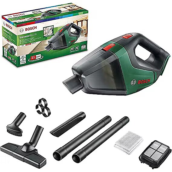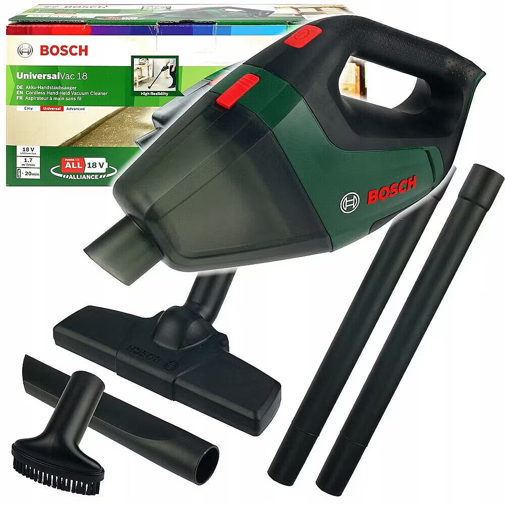 LongDesc - From cleaning floors to dusting drawers – strong suction power to do it allExperience the power and mobility of this cordless vacuum cleaner that cleans even heavier materials with ease. The hand-held UniversalVac 18 comes with extension tubes and a floor nozzle, making it perfect for conveniently cleaning floors. A crevice nozzle makes tight spots no longer hard to reach, and the brush nozzle tackles many different kinds of surfaces swiftly, such as sofas. The vacuum's pre-filter minimises clogging in the main filter, which is easy to clean thanks to its flexible frame. A powerful 18-volt battery delivers high suction power and cordless freedom to clean any room.Power for ALL cordless systems from BoschWhether drilling, cleaning or gardening. Switch quickly and easily between different devices with the 18 V Power for ALL battery from Bosch. For even more flexibility the battery fits also in tools of other Power for ALL battery alliance partner.Minimises clogging for extended suction powerThe pre-filter covers the flat-pleated filter to increase its durability and minimise clogging. This additional protective layer can also be cleaned easily.No surprise interruptionsThe charge level indicator displays the battery charge level at all times, enabling controlled working conditions without unexpected power interruptions or charging delays.Smart protection for a long battery lifetimeBosch Electronic Cell Protection (ECP) prevents the lithium-ion battery from overloading, overheating, and deep discharges for a long lifetime.Compact, lightweight, and always readyLithium-ion batteries are compact and light, they reduce tool weight, don’t suffer from memory effect, and remain charged regardless of storage time.Superior grip for comfort and controlThe softgrip zone provides comfortable tool handling and superior control, a useful feature in applications requiring extensive tool operation.
