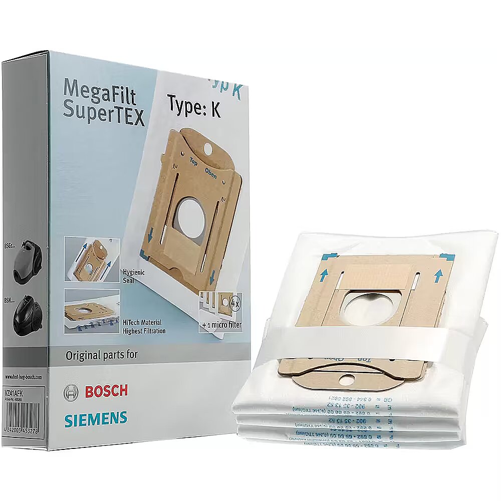 LongSummaryDescription - Bosch BBZ41FK. Savietojamība: Bosch, Siemens. Iepakojuma platums: 235 mm, iepakojuma dziļums: 50 mm, iepakojuma augstums: 165 mm. Putekļu maisiņu skaits: Filtra skaits: 4 gab: Skaitlis: 1 gab.