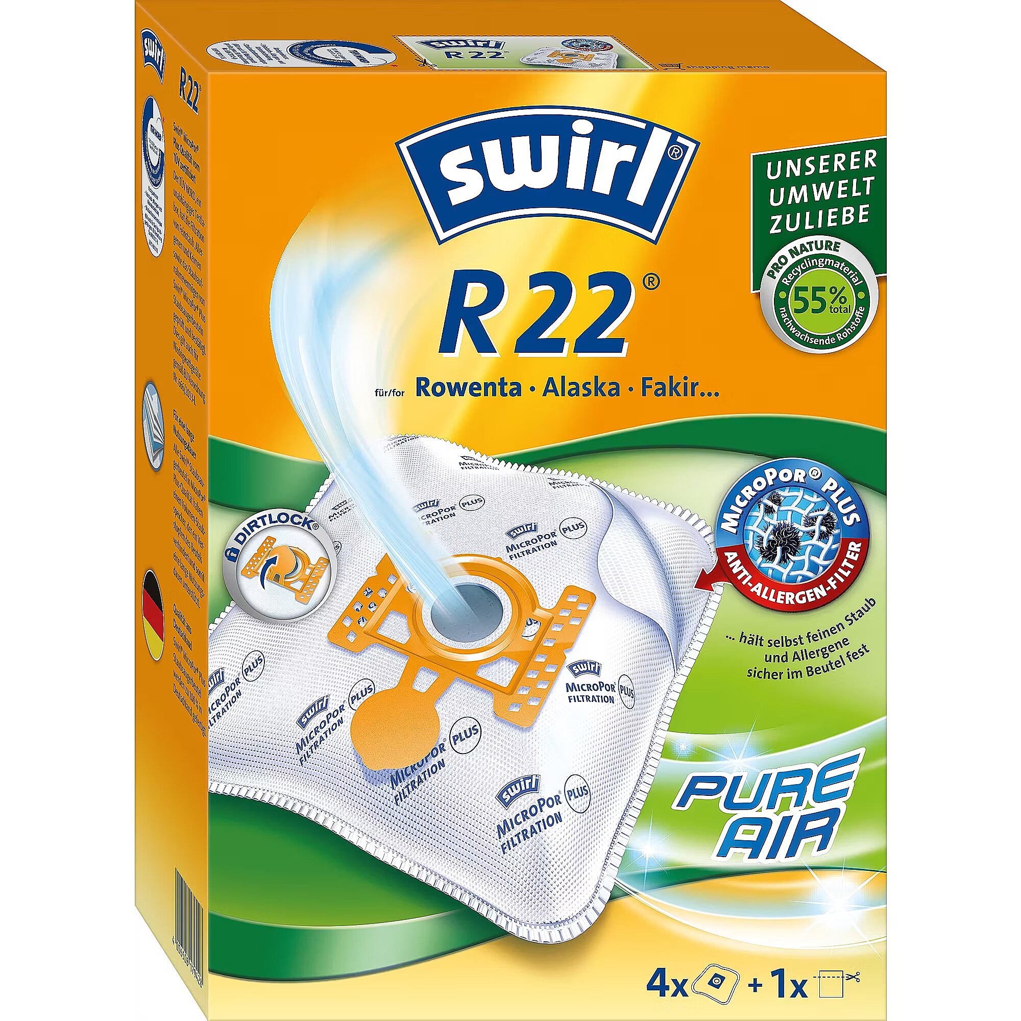 Technical_details - Vacuum cleaner bag R22 AirSpace MicroPor Plus The R22 vacuum cleaner bags with MicroPor Plus feature an anti-allergen filter developed by Swirl that not only keeps normal house dust in the bag, but also fine dust that can cause allergies, such as pollen, mold spores, mite faeces and bacteria. The air in the room is relieved of fine dust, so that allergy sufferers in particular can breathe a sigh of relief. With the Dirtlock dust lock, the bag can be easily closed when changing when it is full. The lock prevents fine dust from getting back into the room air when you change the vacuum cleaner bag. The volume dust storage of the MicroPor Plus vacuum cleaner bags prevents the bag from clogging and ensures a long service life. The Swirl vacuum cleaner bags with the Pro Nature seal consist of 55% recycled material and renewable raw materials. In doing so, they make their contribution to protecting the environment and resources. Type: vacuum cleaner bag EAN: 4006508179428 Manufacturer No.: 179428 Made in Germany Series: MicroPor Plus Bag/Container: Qty | 4 pcs Bag/Container: Filter Type | dry filter Bag/Container: Hygienic Seal | Yes Suitable for: vacuum cleaner Compatible with: Rowenta, Alaska and Fakir Intended use: replacement filter bag Scope of application: home Material: 55% recycled material and renewable raw materials Notes: Incl. exhaust air filter Feature: Reduces allergenic fine dust