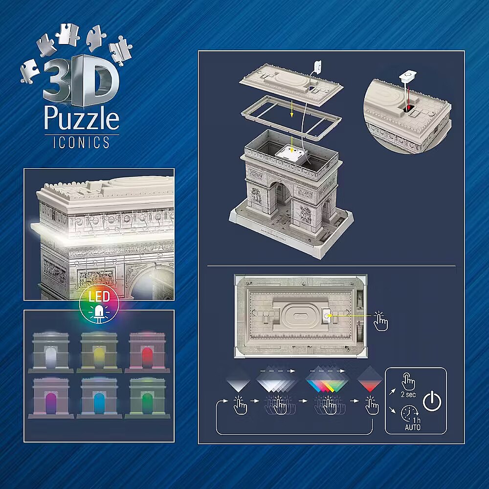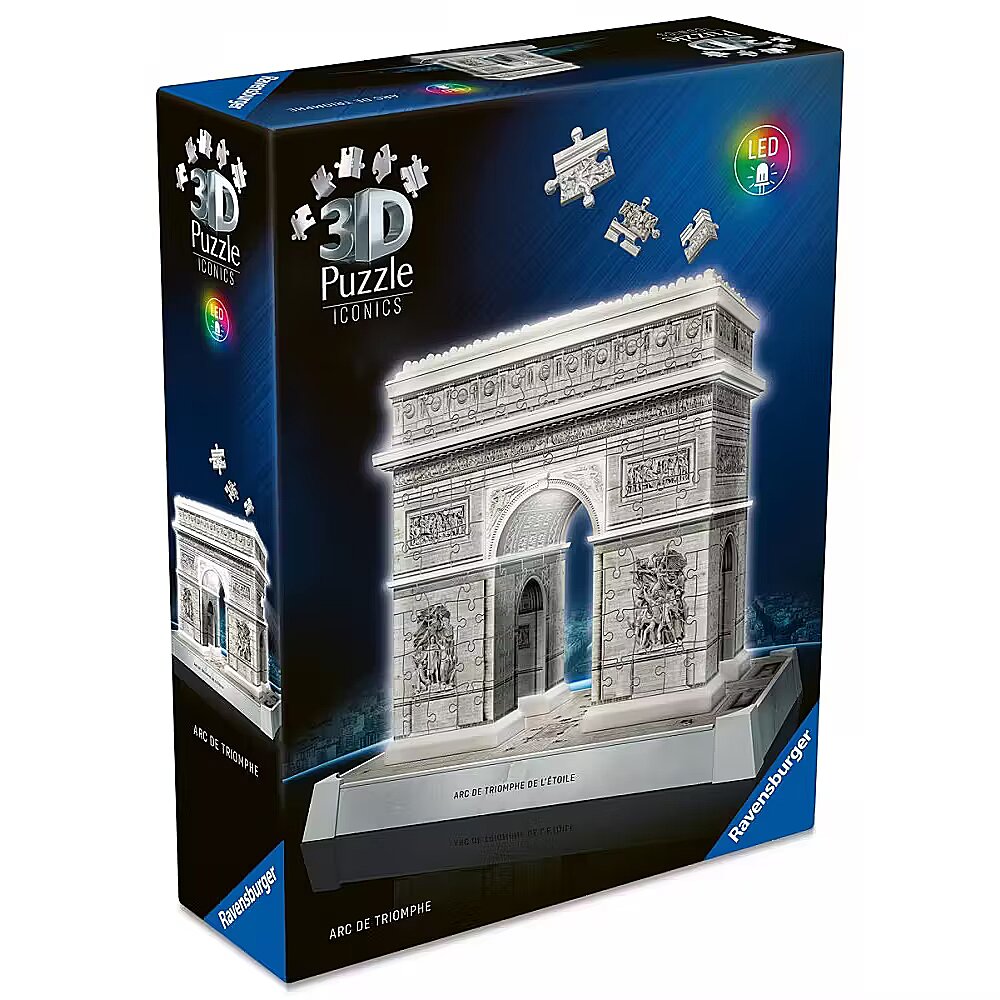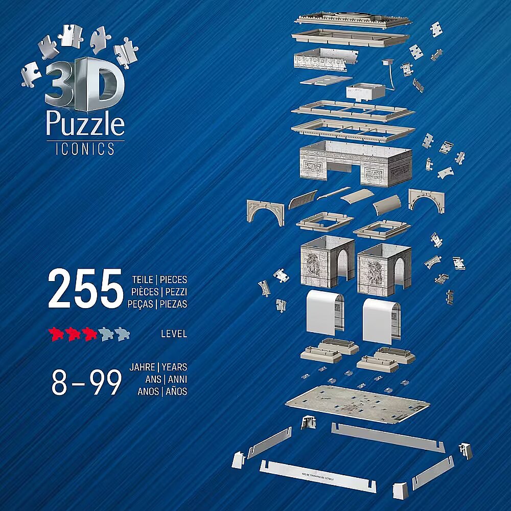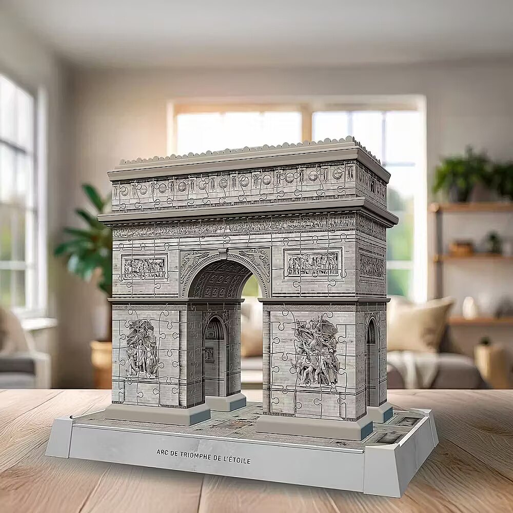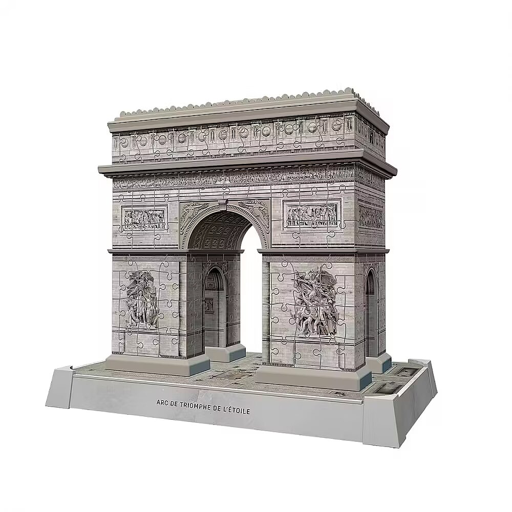 Description - 3D Puzzle - Arc de Triomphe So exciting - so relaxing - so original! Discover a unique three-dimensional puzzle experience with Ravensburger 3D puzzles! Thanks to our Easy Click technology, the plastic puzzle pieces fit together perfectly. Create amazing 3D objects from individually shaped and flexible puzzle pieces - no glue required! Assemble the worlds most famous buildings, such as the Eiffel Tower or the Empire State Building, or find your favorite design in a 3D spherical puzzle from our wide range of patterns with varying numbers of pieces. Enjoy your 3D puzzling adventure!