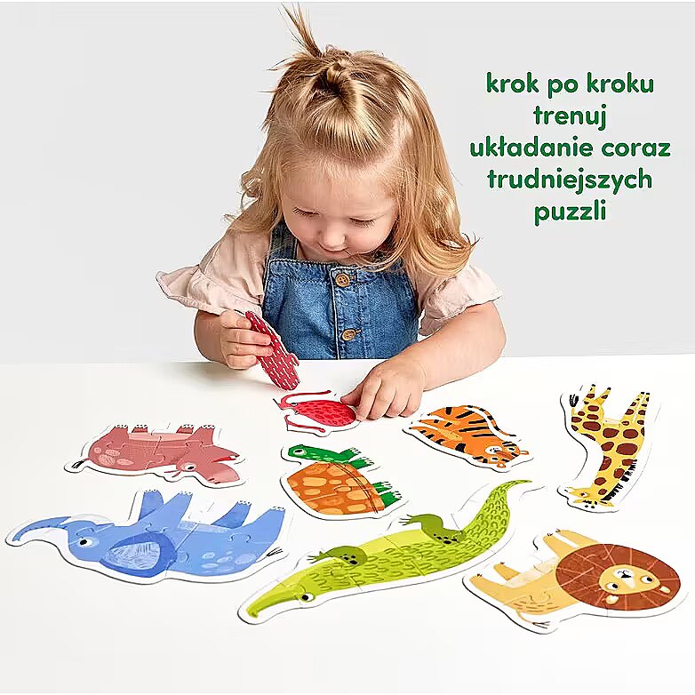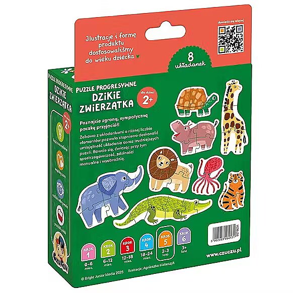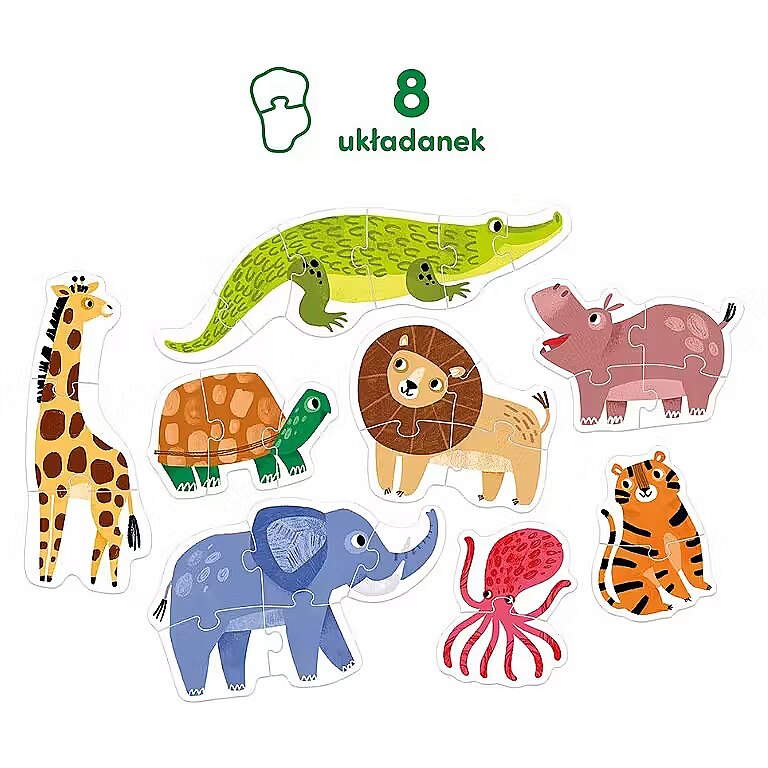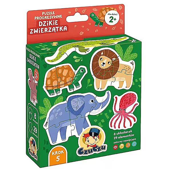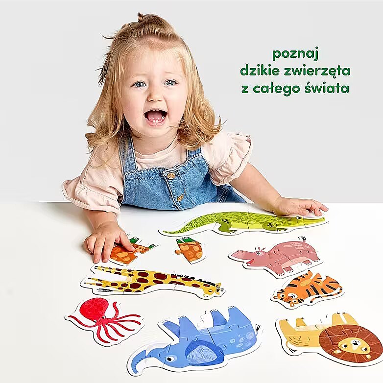 Description - Poznajcie zgraną paczkę dzikich zwierzaków! Przyjaciele z różnych zakątków świata zapraszają do zabawy. Układanki o różnej liczbie elementów pozwalają krok po kroku doskonalić umiejętność układania coraz trudniejszych puzzli. Bawcie się, ćwicząc przy tym spostrzegawczość, zdolności manualne i wyobraźnię. Puzzle progresywne Dzikie zwierzątka pozwalają na opanowywanie umiejętności układania coraz trudniejszych układanek krok po kroku. W zestawie znajdziecie 8 zwierzątek o różnym stopniu trudności: od 2 do 6 puzzli. Spróbujcie: zacząć od ułożenia dwuelementowych układanek, stopniowo zwiększając trudność zabawy, nazywać zwierzęta na ilustracjach, ich kolory i części ciała to wesoła lekcja nowych słów i sposób na poznawanie świata, bawić się w naśladowanie dźwięków i ruchów inspirowanych zwierzakami będzie mnóstwo śmiechu, a przy okazji to świetne ćwiczenie dla buzi i całego ciała! poszukiwać informacji i czytać więcej o zwierzętach z różnych zakątków świata, zadawać pytania i zagadki i w ten sposób utrwalać wiedzę. Dajcie się ponieść wyobraźni!