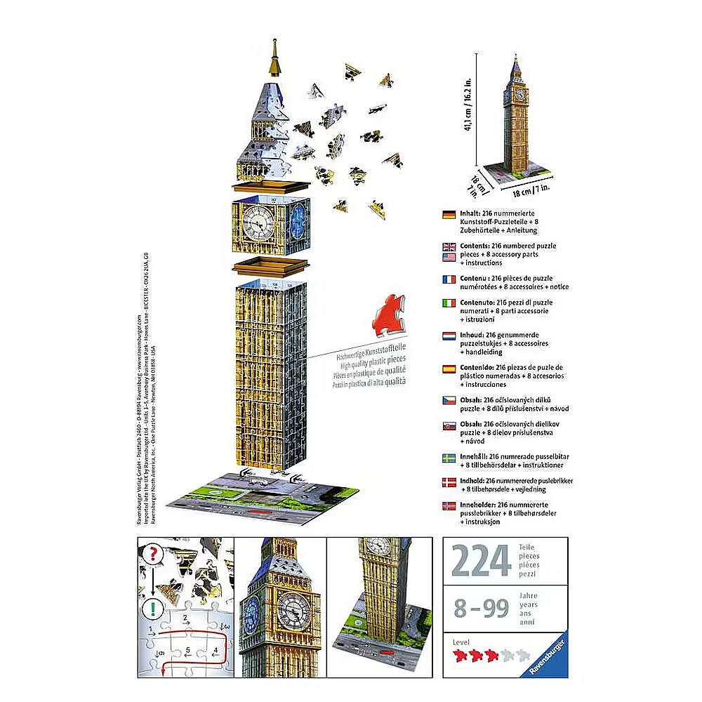 Description - W nowej koncepcji puzzli Ravensburger 3D wykorzystano najnowszą niemiecką technologię stosowaną przy produkcji puzzli! W tej układance zastosowano niepowtarzalne elementy zawiasowe z tworzywa sztucznego, które po połączeniu tworzą ten solidny i wytrzymały budynek. Bez użycia kleju! Układanka składa się 216 wysokiej jakości plastikowych elementów i po złożeniu ma 41 cm. Na odwrotnej stronie każdego elementu układanki nadrukowany jest numer, dzięki czemu można złożyć układankę albo przez dopasowanie wzoru na oko lub po prostu według kolejnych liczb. W zestawie puzzli znajduje się drukowana płyta podstawki, dzięki czemu model można ładnie wyeksponować na półce lub blacie stołu. Jeden z najsłynniejszych budynków świata może być ozdobą twojego domu!