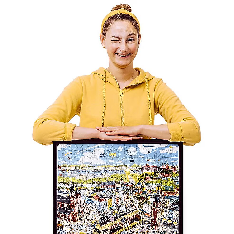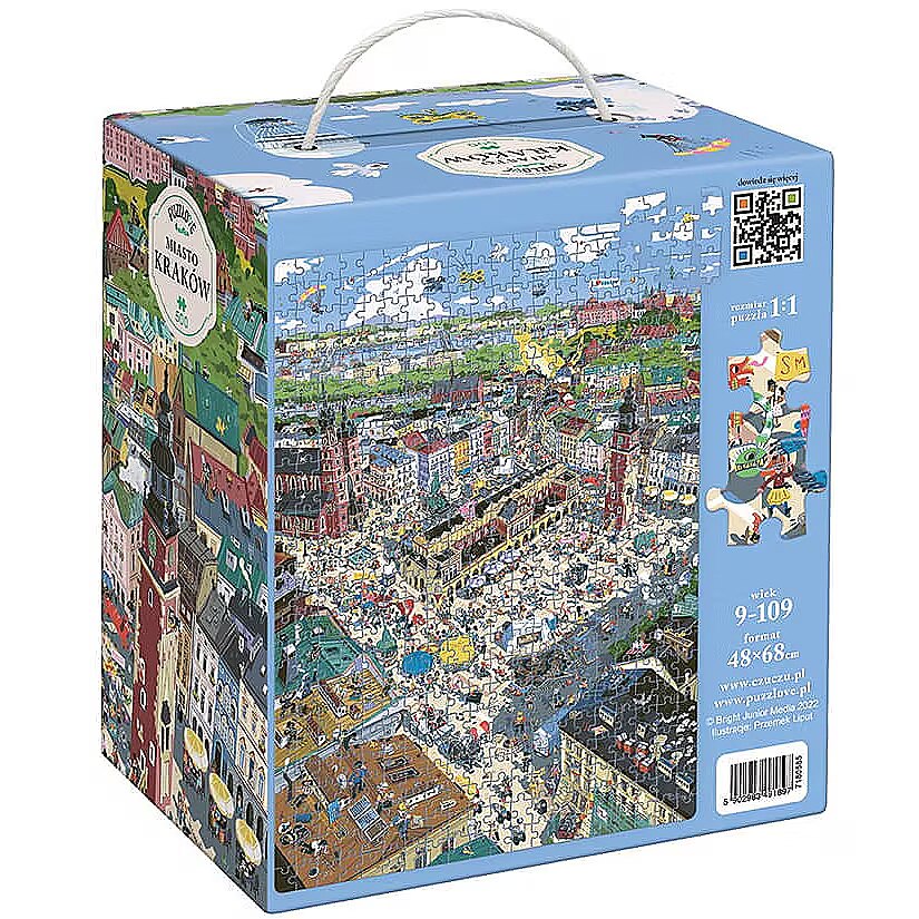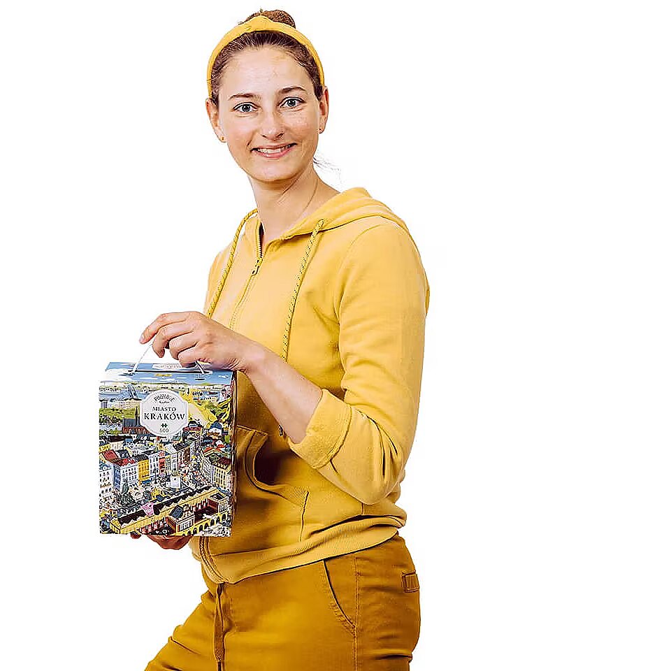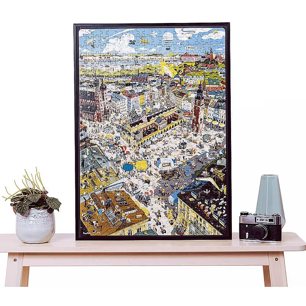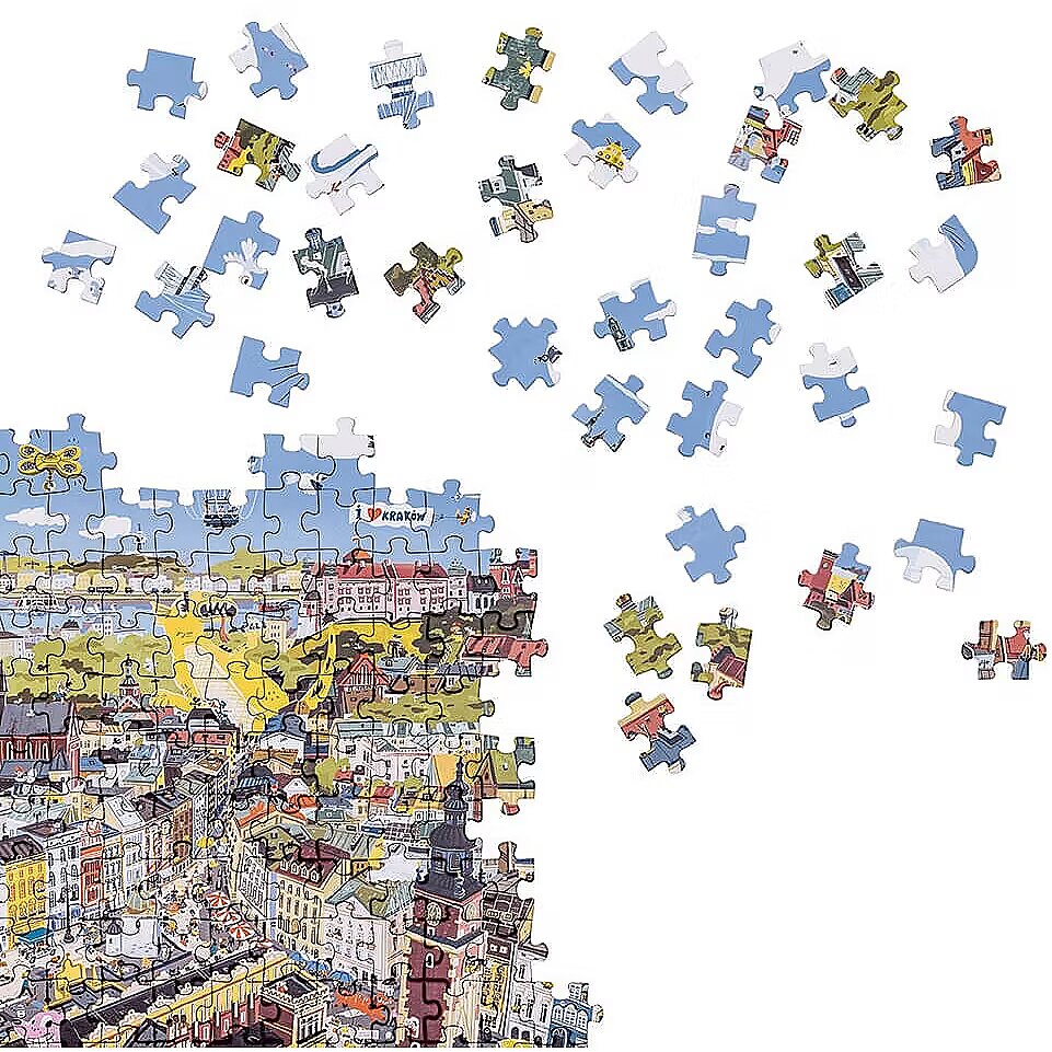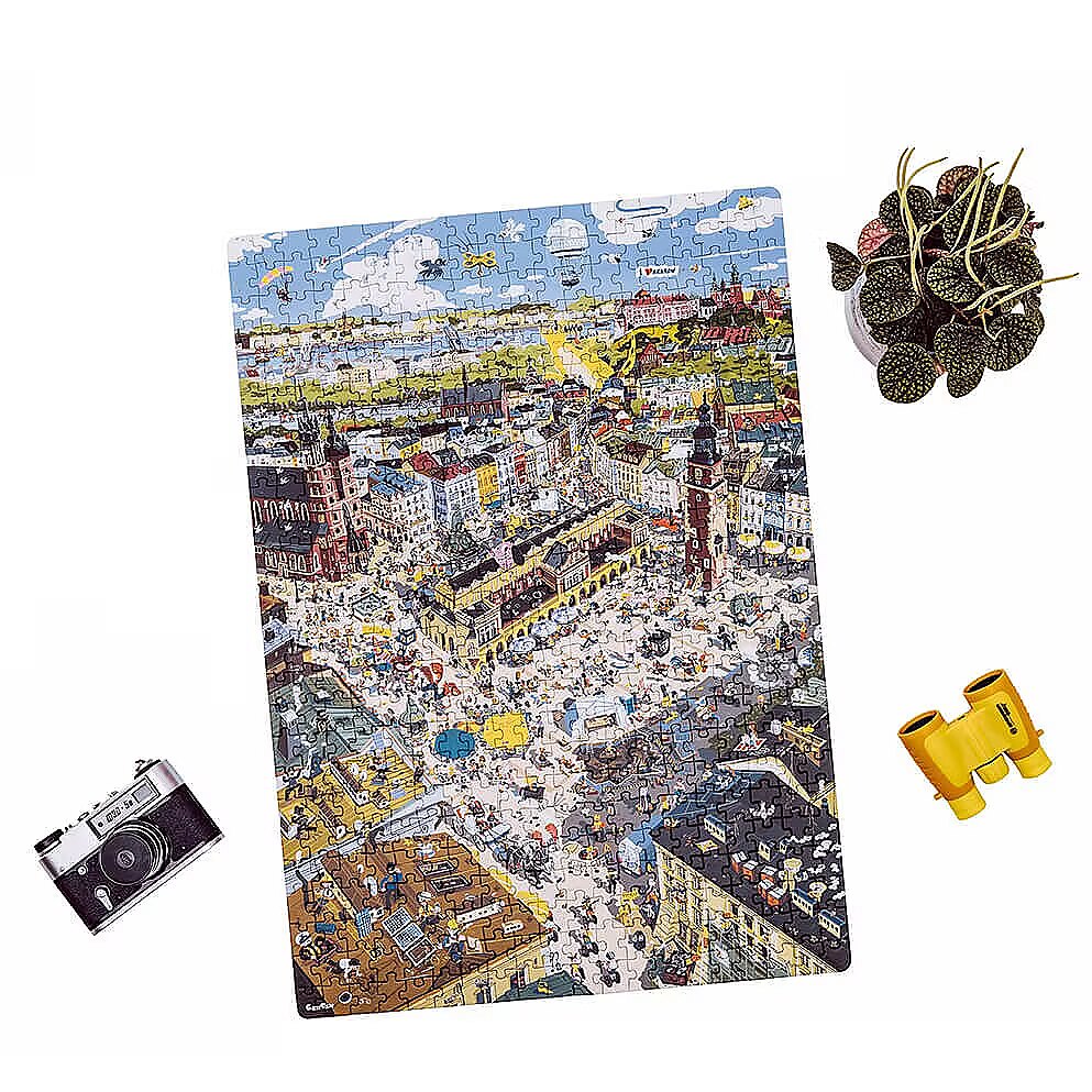 Description - Puzzle 500 elements Puzzlove - City of Krakow Let's meet under Adas on the Krakow Market Square and go sightseeing together in one of the most beautiful cities in the world! Large, full of details illustration shows the most famous and worth visiting places in Cracow. Here, reality mixes with fantasy and history, famous and legendary inhabitants stroll with tourists and modern Cracovians. Put the puzzle together and find out if it is still raining in Kraków on Bracka Street? Where has the Golden Boot gone? What happened to the Lady with an Ermine? What is Copernicus looking for? Play as you like! Puzzlove City of Krakow from CzuCzu is a great idea for a beautiful gift not only for Cracovians! Jigsaw puzzle lovers, tourists, historians, adults and children, city dwellers and visitors to Krakow will find something for everyone. The huge jigsaw puzzle consists of 500 elements and depicts real, historical and magical places and situations. Krakow wasn't built right away, so put together the jigsaw puzzle as you like: With friends or family or by yourself At home, on holiday or in Krakow To practice patience Looking for real, legendary and historical figures, places and events (for example with a history book or guide to Krakow in hand) Out of sentiment, love for beautiful places and for the joy of jigsaw puzzles, or when planning your next trip or city break in Krakow Put the puzzle together and test your perceptiveness and knowledge: Do you know all the places from the illustrations? Can you identify the legendary and historical inhabitants of the city? Can you tell what or whom you can find in the real Kraków, and what is a figment of the illustrator's imagination? Find in the illustration: Nicolaus Copernicus, Queen Bona, the Lajkonik, Mr Twardowski, the Lady with the Ermine, the Yellow Lace, the Wawel Dragon, check if it is still raining on Bracka! See you on the Market Square!