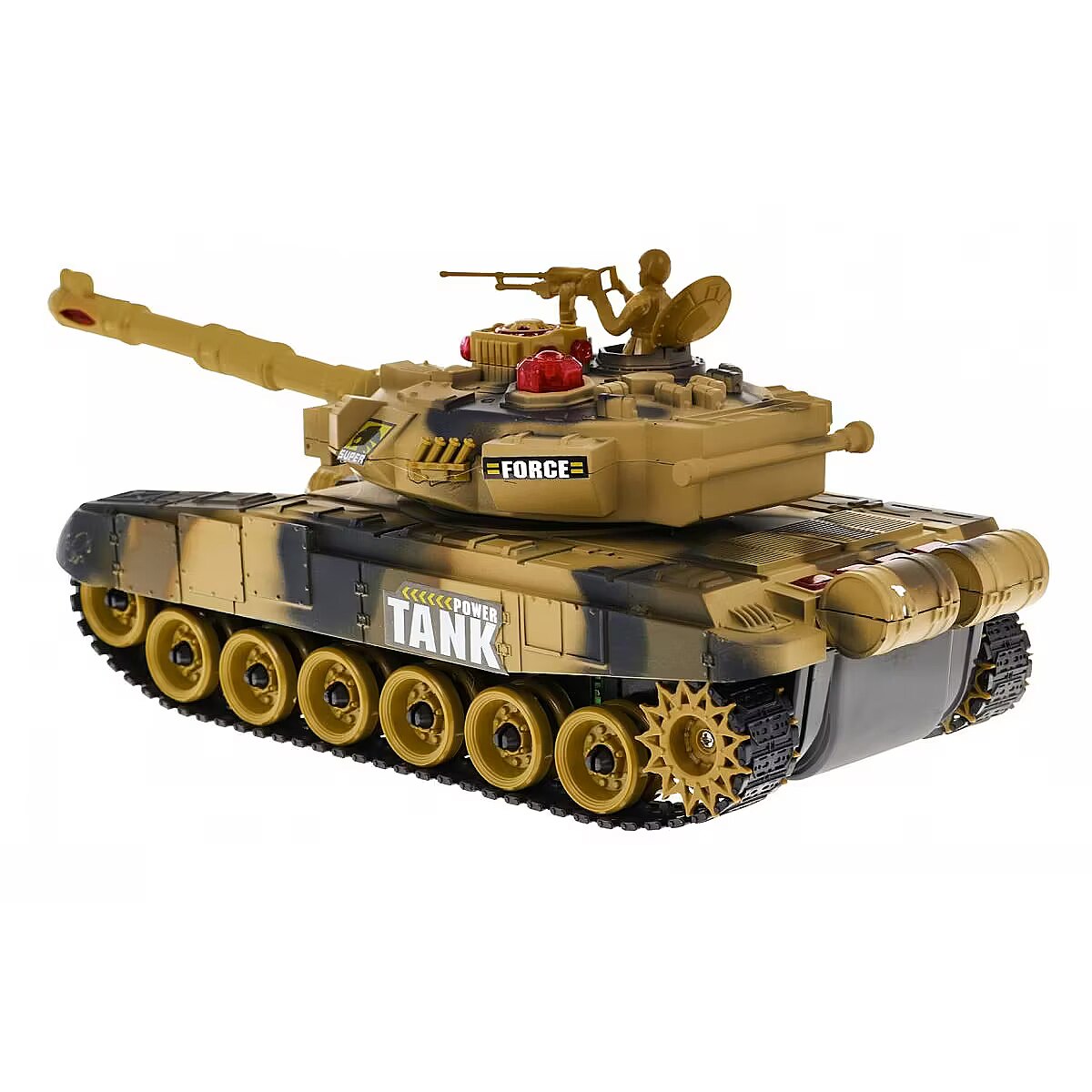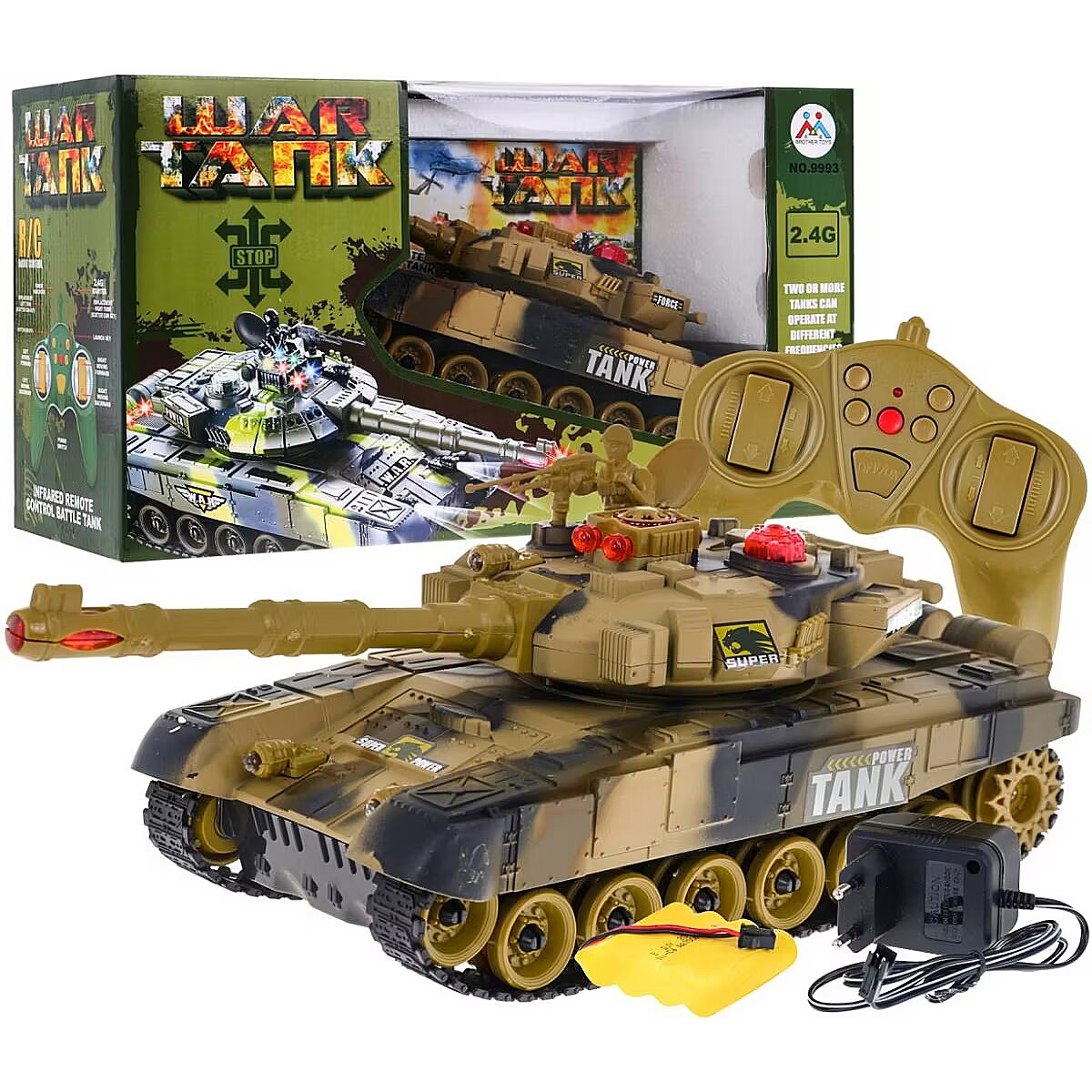 Atverama lūka uz torņa - tajā mēs varam ievietot tankistu ar ložmetēju. Stūrēšana - transportlīdzekli var vadīt uz priekšu, atpakaļ, pagriezt pa labi un pa kreisi, kā arī pagriezt uz vietas kā īstu tanku. DZIESMU EFEKTI: - dzinēja troksnis, - lielgabala šāviena skaņa, - šaujoša ložmetēja skaņa. GAISA EFEKTI: - kvēlojoši lukturi uz transportlīdzekļa un uz torņa, - elektroniskais jaudas indikators transportlīdzekļa aizmugurē. Komplektā ietilpst - 1 transportlīdzeklis, - 1 tālvadības pults, - 1 uzlādējamo bateriju komplekts (AA 700mAh, 4,8 V), - 1 USB lādētājs uzlādējamām baterijām, Izmēri - garums aptuveni 340 mm, - augstums aptuveni 110 mm, - platums aptuveni 120 mm.