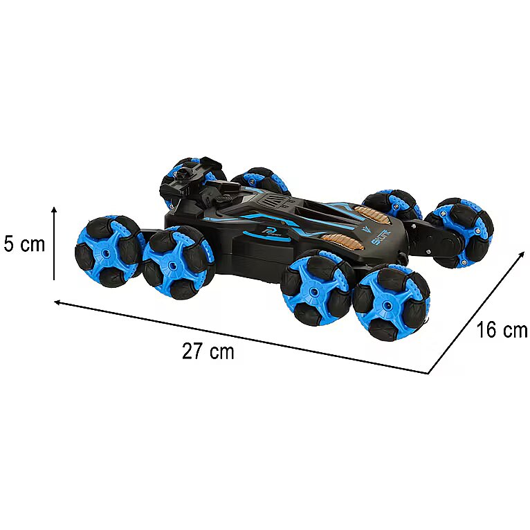 description_lv - Neparasti-tas ir veids, kā aprakstīt šo tālvadības automašīnu! Un kas padara to izceļas? Pirmkārt, 8 riteņi, kurus var manevrēt tādā veidā, ka automašīna pārvarēs visus šķēršļus – pat kāpnes. Kontrolierī papildus klasiskajām pogām automašīnas vadīšanai četros virzienos ir arī riteņu pārveidošanas funkcija. Tas ļauj bērniem viegli mainīt šasijas augstumu, pielāgojot to dažādām virsmām un šķēršļiem. Automašīnai ir vairākas papildu funkcijas, kas padarīs atskaņošanas laiku patīkamāku: mūzika, gaismas un pat izplūdes gāze, no kuras izplūst tvaiks. Komplektā ietilpst arī rokas kontrolieris, kas ļauj vadīt automašīnu, izmantojot žestus. Tehniskās specifikācijas: Materiāls: plastmasa, gumija Krāsa: melna un zila Vecums: 6+ Riteņu skaits: 8 Strāvas padeve tradicionālajam kontrolierim: 2x AA baterija (nav iekļauta komplektā) Strāvas padeve rokas kontrolierim: 2x AAA baterija (nav iekļauta komplektā) Automašīnas barošanas avots: 3.7 V 500 mAh uzlādējams akumulators (iekļauts komplektā) Akumulatora uzlādes laiks: 2-3 stundas Automašīnas izmēri: 27 cm x 16 cm x 5 cm Riteņu diametrs: 5 cm Iepakojuma izmēri: 28.5 cm x 16.5 cm x 8 cm Iestatīt saturu: Automašīna Tradicionālais kontrolieris Rokas kontrolieris Uzlādes kabelis Skrūvgriezis Ūdens tvertne