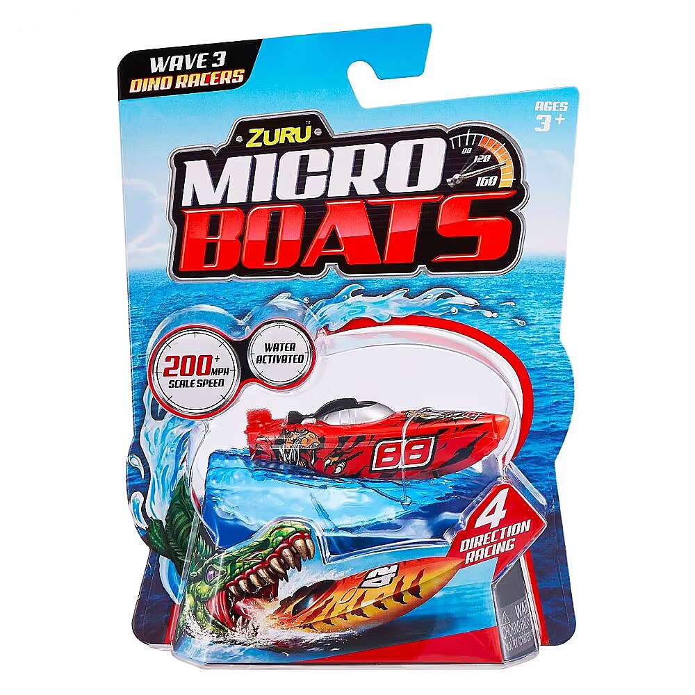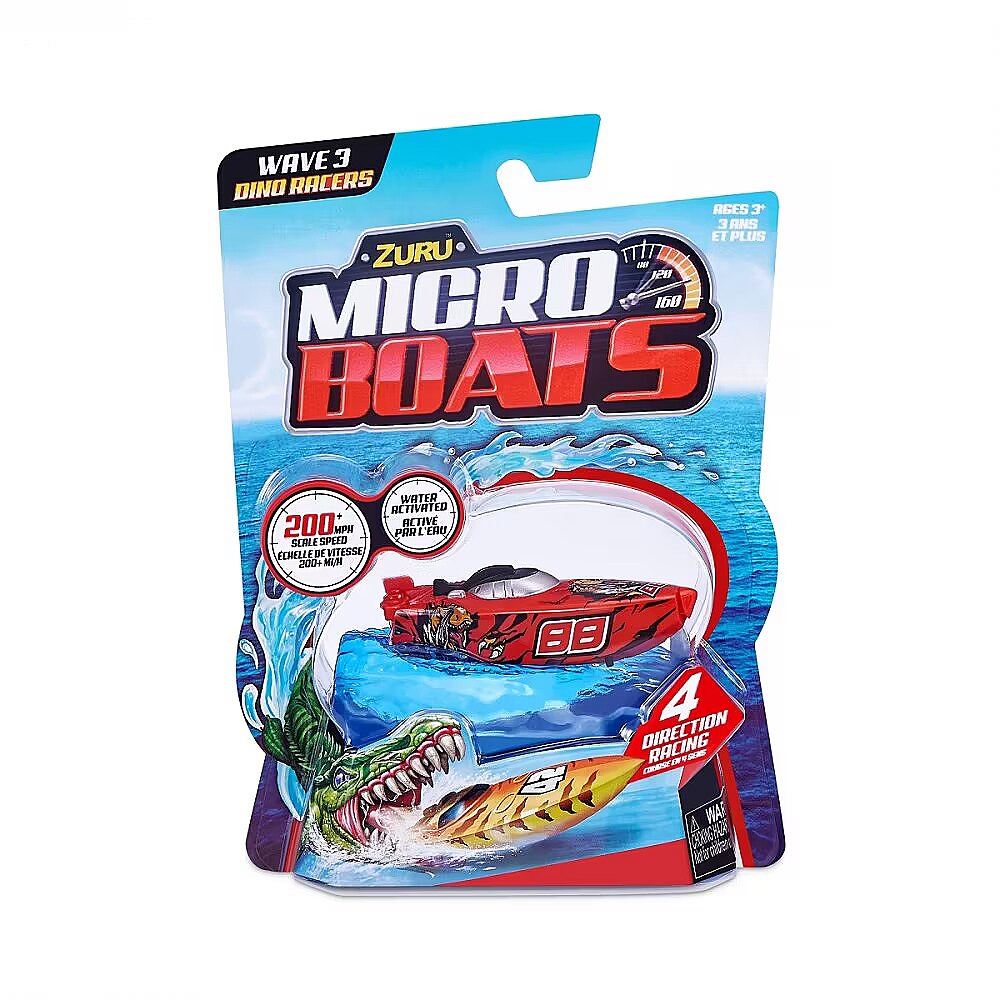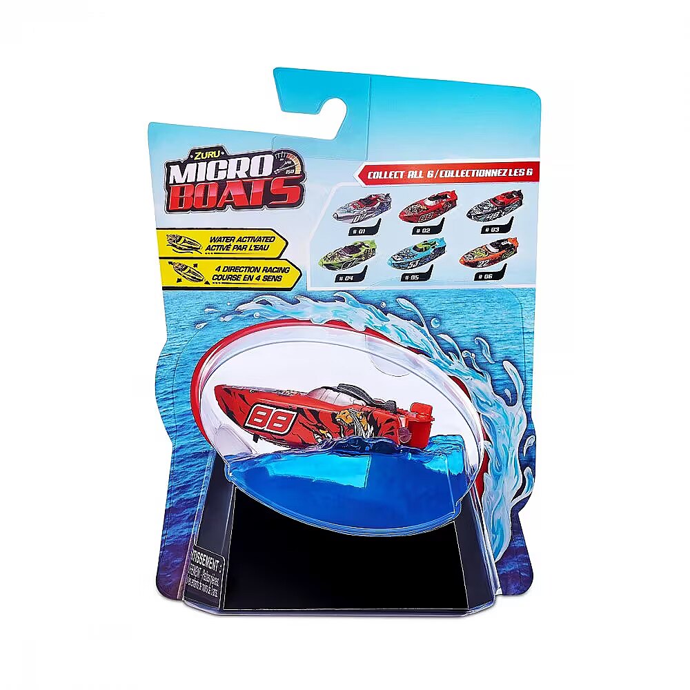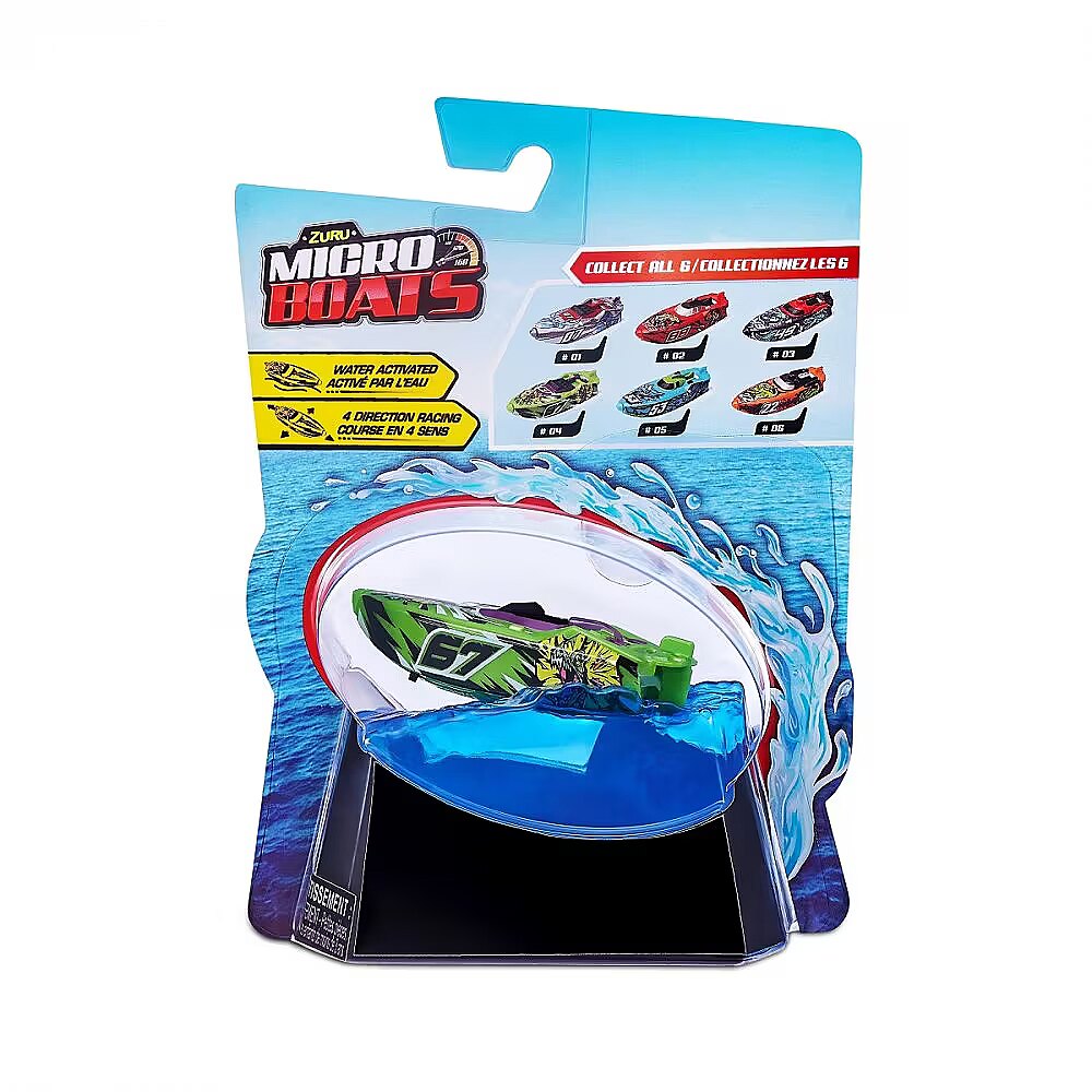 Description - Micro Boat ZURU Micro Boats are fully motorized, self-steering speedboats that make full 360° rotations and automatically reverse when hitting a wall thanks to the latest microrobot sensor technology! Race in all four directions at an incredible speed of over 320 km/h! Smart technology allows Micro Boats to save battery by going to sleep mode after a certain amount of activity! To start his motor, just place him in the water and he will automatically go ahead! Move the rudder to different positions to perform tricks! Race against your friends or perform crazy stunts in different environments, such as a pool, bathtub, sink or other body of water! Only the horizon is the limit! The micro boats come in a variety of colors and models, so you can collect them all and grow your fleet! Different patterns. The product is sent randomly, it is not possible to choose a specific model. The price is for 1 pc.