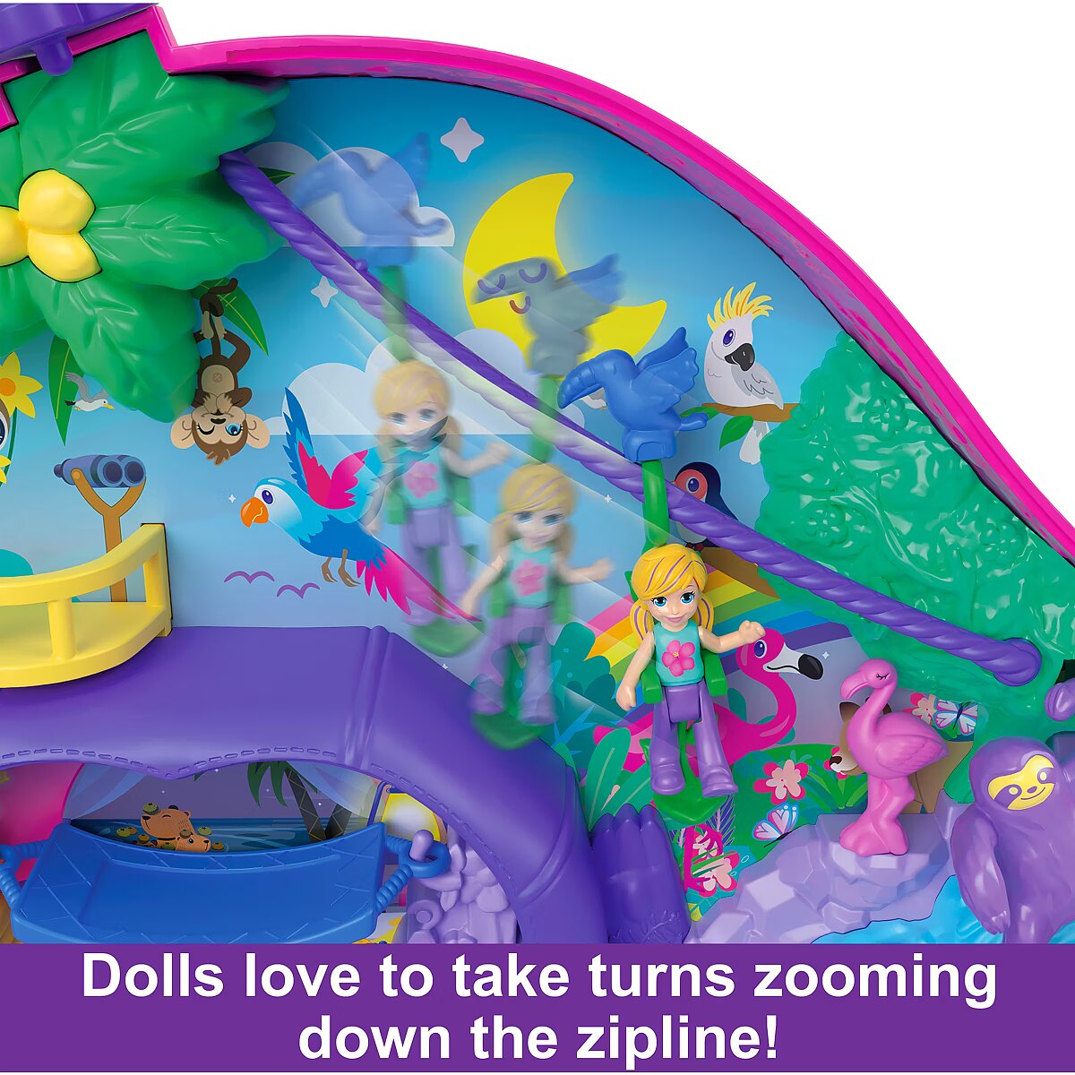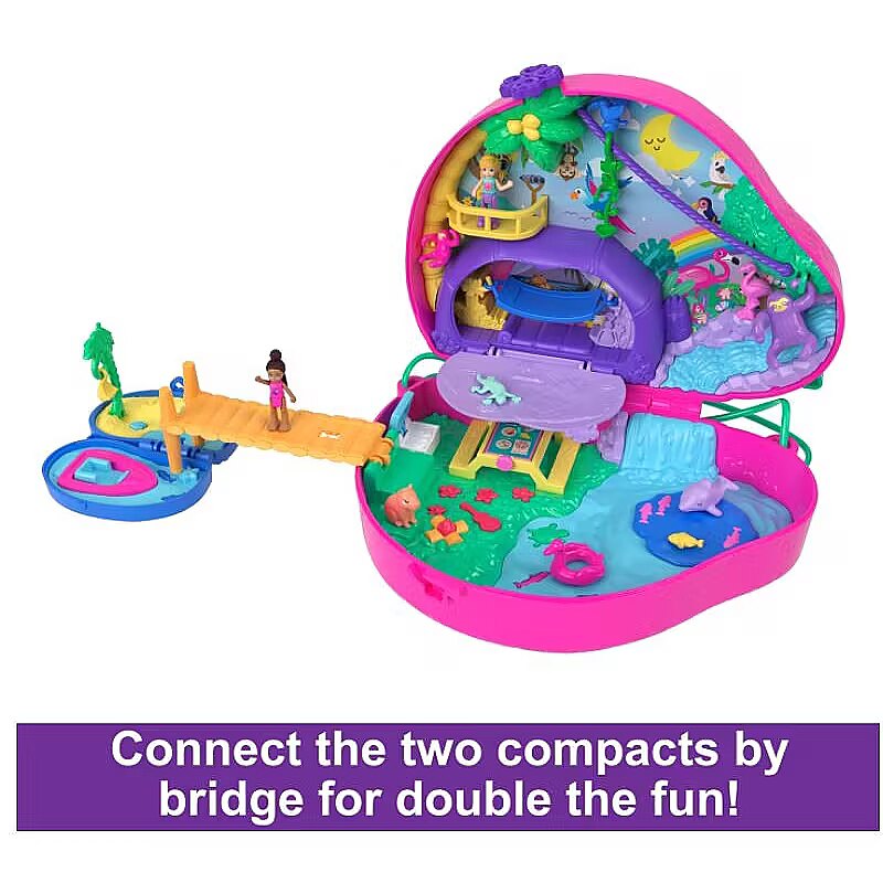 Description - Welcome to the fun world of Polly Pocket with the Lazy Family Compact Bag set. From the outside, it looks like a mama sloth with a toddler attached to her belly. Both pieces open up to reveal a tropical jungle with 2 micro dolls and 12 accessories (including 8 animal figures). The two pieces are connected by a bridge it's like 2 sets in 1! Ride the tyrolean with the toucan in one part of the set, or open the lazy tent to discover a comfy hammock. Take a splash in the pool with a waterfall! And then stroll across the bridge to the other part of the set, where a beach with bananas to pluck and a boat cruise awaits. When you want to take the set with you, simply connect the two pieces together and then use the included strap to carry it like a handbag. A great gift for children aged 4 and up, especially those who love animals! Colours and decorative elements may vary.