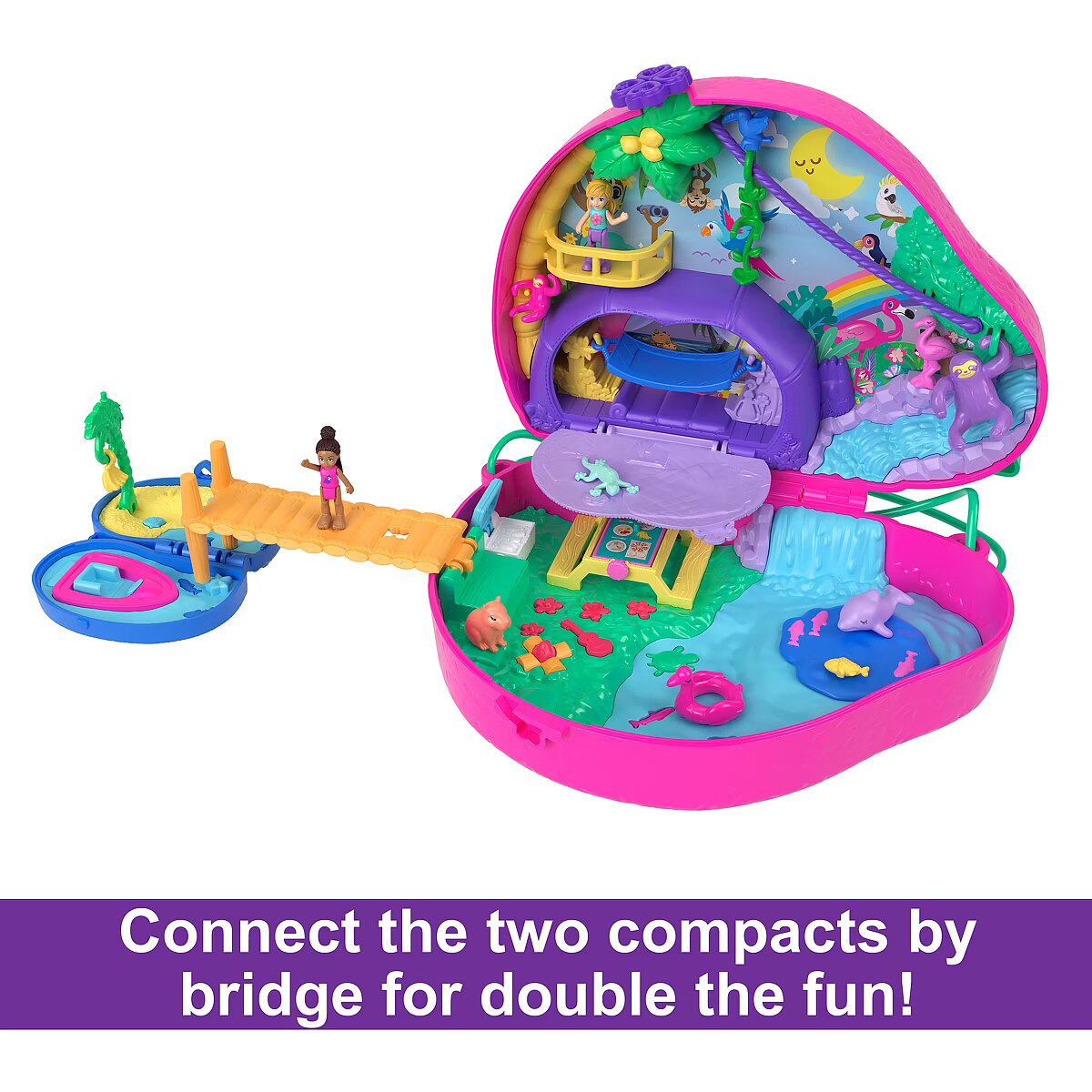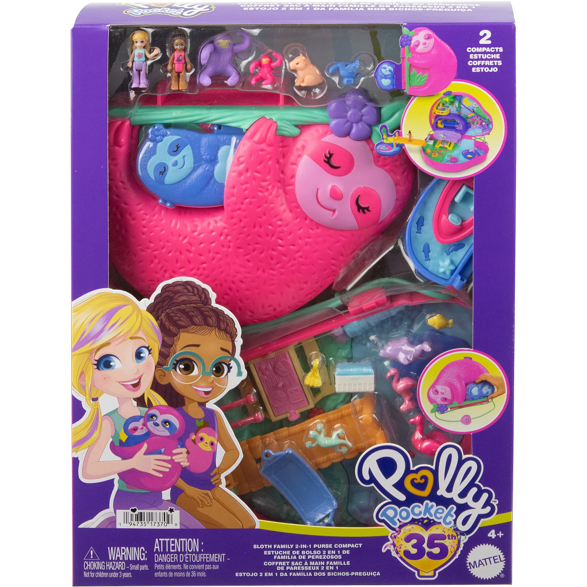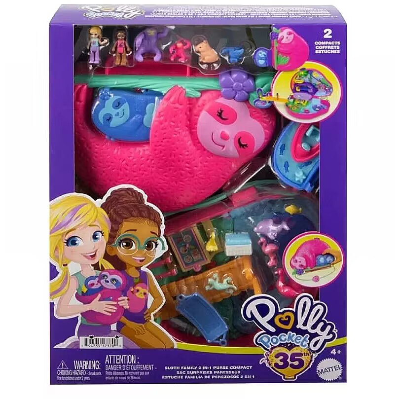 LongDesc - Swing into Polly Pocket fun with this adorable Sloth Family 2-in-1 Purse Compact! The purse exterior is shaped like a momma sloth with a baby sloth compact latched onto her belly! Both momma and baby sloth open to reveal tropical jungle themed playsets with 2 micro dolls and 12 accessories (including 8 pets)! The two compacts connect by bridge for the ultimate 2-in-1 play experience. Zoom along the zipline with a toucan friend in the momma sloth compact or open the sloth tent to reveal a comfy hammock. Make a splash and go for a spin in the waterfall pool! Then, walk over the bridge to the baby sloth compact and find a secret beach to pick bananas or go for a boat ride! When it's time to go, latch the two compacts and use the purse strap to play anytime, anywhere! The perfect gift for ages 4 years old and up, especially those who love animals! Colours and decorations may vary.