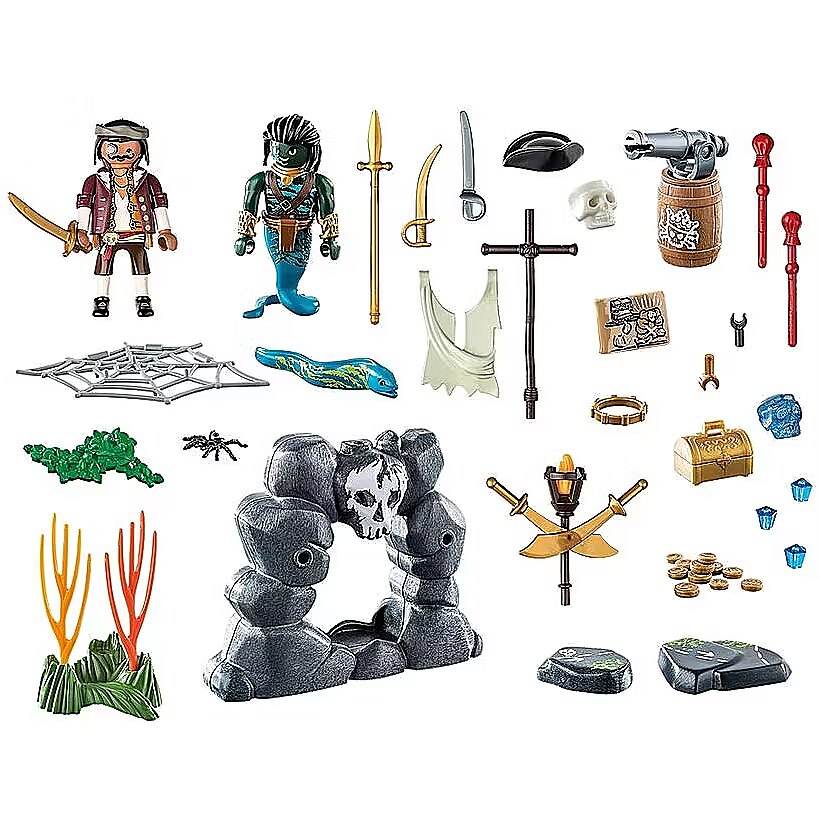 Iekļautie piederumi - Skaitļi: 1 pirāts, 1 jūrasgrundulis Dzīvnieki: 1 jūrasgrundulis, 1 zirneklis Papildu elementi: 1 klints, 2 akmeņi, 1 zirnekļa tīkls, 1 efejas vīnogulājs, 1 lielgabala muca, 2 raķetes, 1 koka krusts, 2 galvaskausi, 1 pirāta cepure, 1 apmetnis, 1 dārgumu lāde ar monētām, 3 dārgakmeņi, 1 kronis, 1 dārgumu karte, 1 lāpa ar 2 zobeniem (rotājums), 1 šķēps, 3 zobeni.