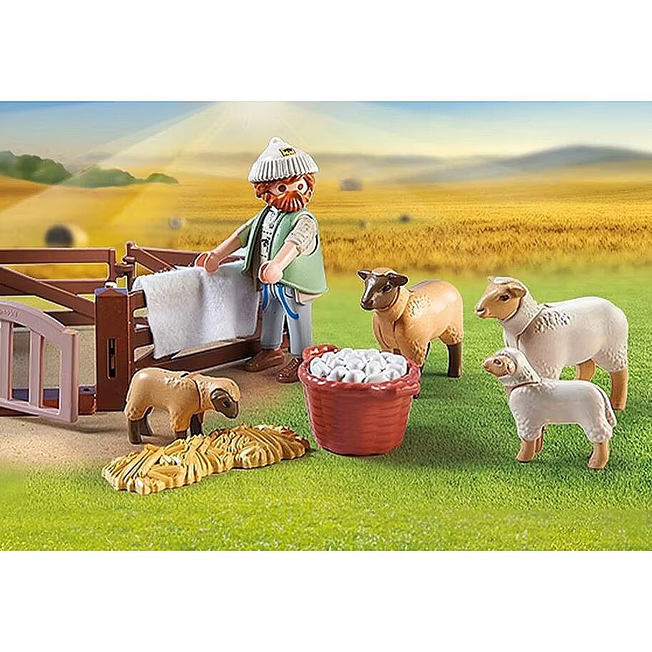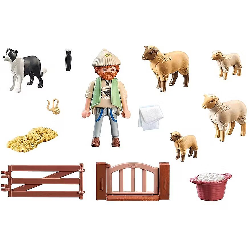 Accessories included - Figures: 1x man; Animals: 1x border collie, 2x sheep, 2x lamb; Accessories: 2x fence elements, 4x sheep horse, 1x long hair cutter, 1x bottle basket, 1x knitted hat, 1x fabric blanket felt, 1x ball of wool, 1x straw strip, 1x potatoes