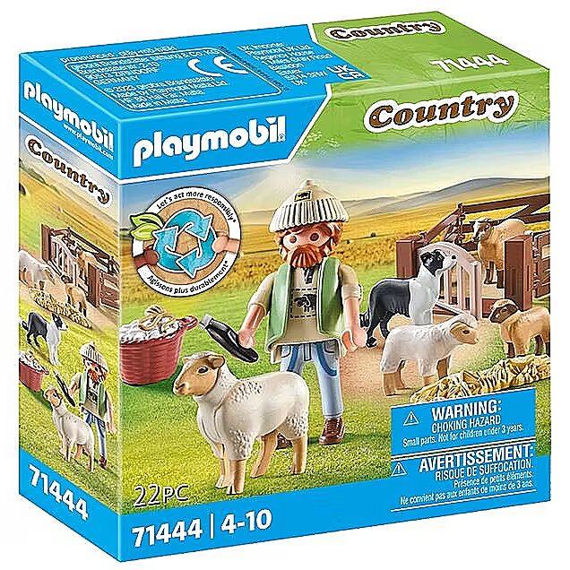 Technical_details - Sheep are also taken out to pasture in PLAYMOBIL Country. The shepherd who is included in this set with sheep, lambs and a dog is responsible for this. The shepherd wears a knitted hat and has plenty of accessories for shearing sheep. A great playset for sheep friends ages 4 and up. Item no.: 100034238 Kind of construction toy EAN 4008789714442 Manufacturer no. 71444 Country series Parts 22 pieces Contents/equipment figures: 1 man. Animals: 1 border collie, 2 sheep, 2 lambs. Accessories: 2 fence elements, 4x sheep pen, 1 long hair trimmer, 1 bottle basket, 1 knitted hat, 1 felt fabric blanket, 1 ball of wool, 1 strip of straw, 1x potatoes Age recommendation from 4 years to 10 years Target group kindergarten children, school children Material: Plastic Warnings Warning: Not suitable for children under 36 months! Caution: Danger of suffocation due to small parts that can be swallowed! Further information On average, the plastic contained in this set is made from over 80% recycled and bio-based materials.