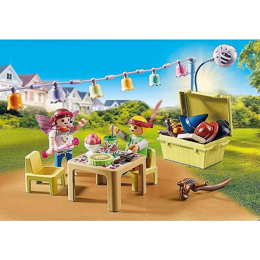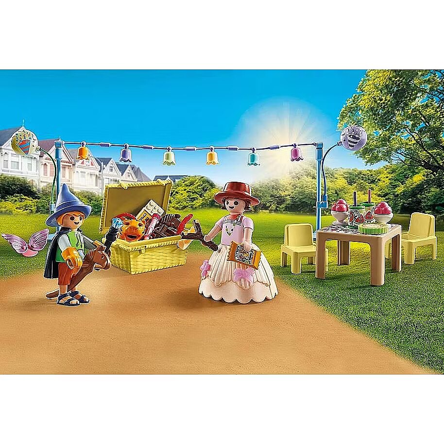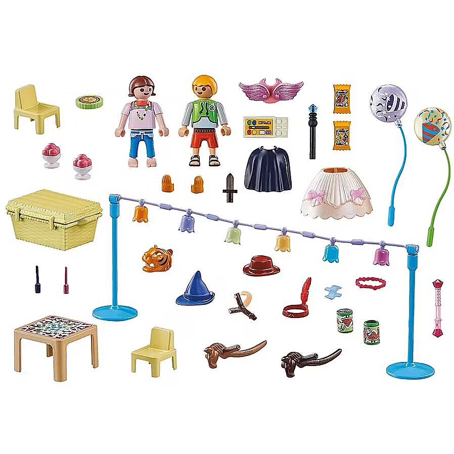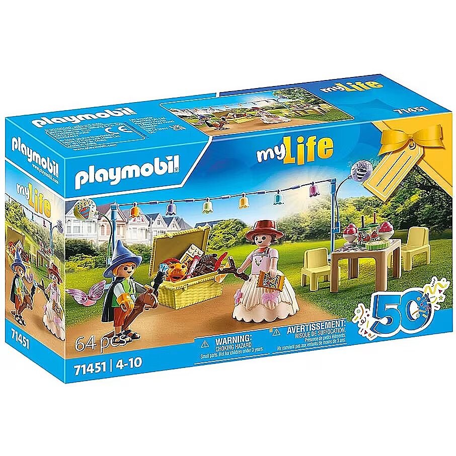Technical_details - Let's go to the great costume party in PLAYMOBIL City! And this is where things get really crazy, because the children can slip into many different roles: magician with hat and magic wand, princess, cowboy, Indian, tiger or angel - everything is possible. And during breaks there is ice cream and other treats to eat. The garland with lanterns in a flower look ensures the best celebration atmosphere. Item no.: 100034542 Kind of construction toy EAN 4008789714510 Manufacturer no. 71451 City Life series Parts 64 pieces Content/equipment Figures: 2 children. Accessories: 1x angel wings, 1 cape, 1 staff, 2 balloons, 1 dagger, 1 dress, 1 cake, 2x ice cream, 1 box, 1 table, 2 chairs, 1 garland, 1 tiger mask, 1 wizard hat, 1 cowboy hat, 1 slingshot, 2 hobbyhorses Age recommendation from 4 years to 10 years Target group kindergarten children, school children Material: Plastic Warnings Warning: Not suitable for children under 36 months! Caution: Danger of suffocation due to small parts that can be swallowed!