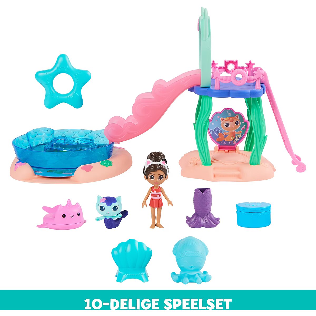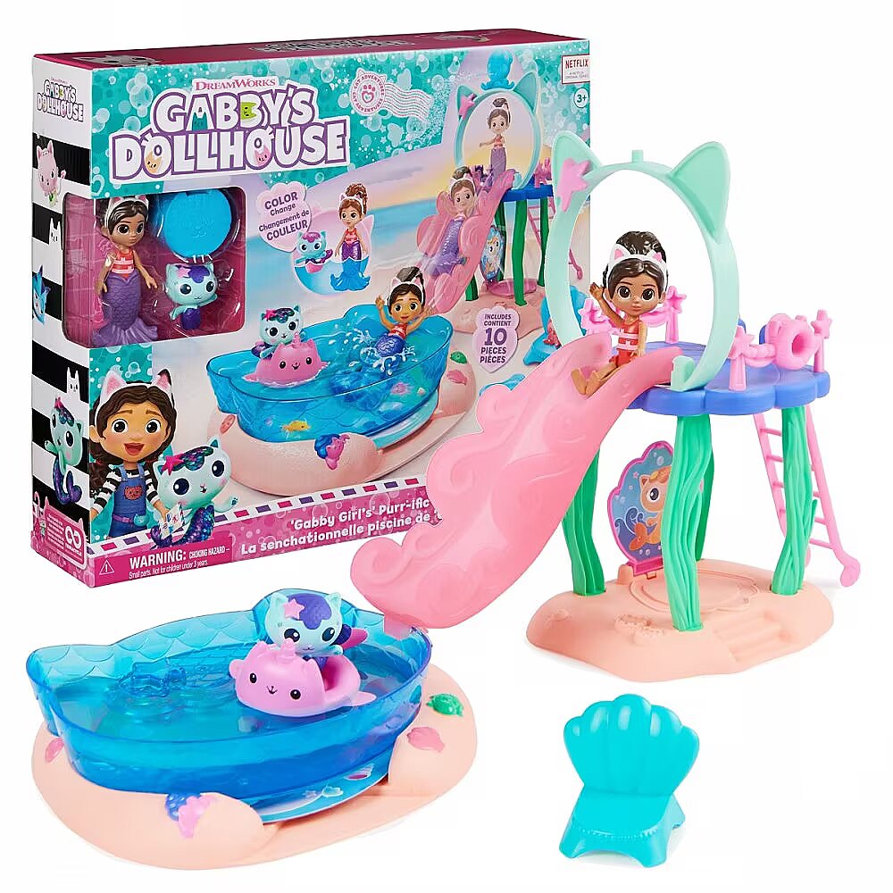 LongDesc - Get ready for some cat-tastic fun in the sun with Gabby and MerCat in the Gabby Girl’s Purr-ific Pool Playset! Join Gabby and MerCat, with their color-changing mermaid tails, as they spend a fun-filled day out by the swimming pool! But, before heading out, first unbox your dollhouse delivery, just like Gabby does in the show, to reveal a surprise toy that will join in the adventure! After unboxing your dollhouse delivery, head to the pool and discover the hidden portrait of MerCat’s sister, Sunny Cat, in the giant clam beneath the slide! Put on Gabby’s mermaid tail before climbing up the ladder to the top of the slide. Then, give Gabby and MerCat a quick squirt of warm water using the Squiddy Kitty squirter, to activate their awesome color-changing mermaid tails. Afterwards, slide down the splish and splash into the water below! After a few trips up and down the slide, Gabby can remove her mermaid tail and lounge on the pool floats with MerCat, as they spend the rest of the day relaxing out by the pool! Kids will love re-creating their favorite pool-side scenes from the Gabby’s Dollhouse series with Gabby and MerCat. For even more exciting pretend play adventures, connect the slide ladder to the upper floor of Gabby’s Dollhouse and start a pool party with the rest of Gabby and MerCat’s Meow-mazing kitty friends, like Cakey Cat and Pandy Paws! (Dollhouse and additional figures sold separately) For one last surprise, scan the QR code inside the Dollhouse Delivery to unlock a special reward in the free Gabby’s Dollhouse App (available on iOS and Android). Gabby’s Dollhouse stuffed animals, dolls, toy figures and playsets are the perfect toys for girls and boys that love using their imagination to create their own dollhouse world, so prepare for endless adventures sliding and splashing with the Gabby’s Dollhouse Pool Playset!INCLUDES: 1 Playset, 1 Gabby Figure, 1 MerCat Figure, 1 Mermaid Tail, 3 Pool Accessories, 1 Opening Clam, 1 Dollhouse Delivery, 1 Octopus-Cat, 1 Chip-art Disk