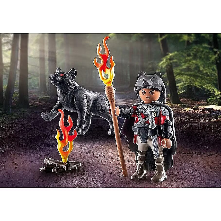 Accessories included - Figures: 1 man; Animals: 1 wolf Accessories: 1 campfire, 1 knife, 1 cape, 1 wolf hat, 1 staff with torch