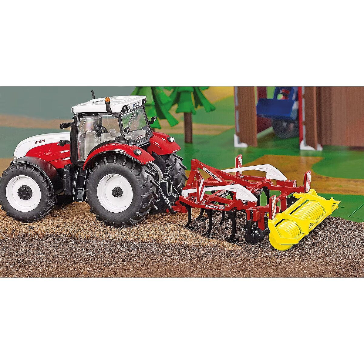 LongDesc - The Synkro model from Austrian traditional manufacturer Pöttinger is one of the latest cultivator devices on the market. The original version is a 3-metre wide cultivator with metal frame and as well as forks also comes fitted with removable rotating rollers. This model's striking colour paintwork is easily used in combination with 1:32 scale SIKU tractors.