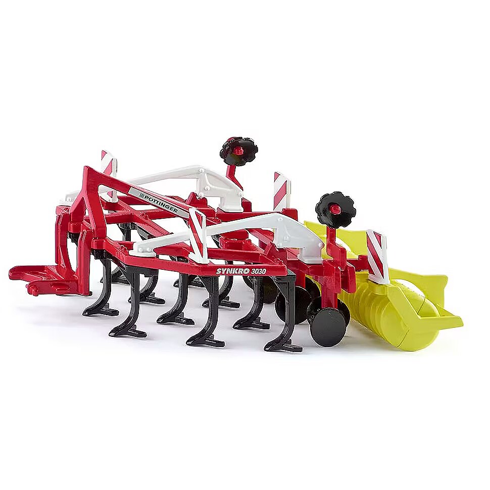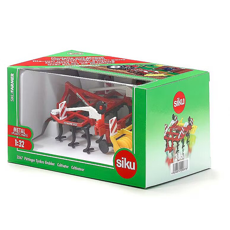 LongDesc - Austrijas tradicionālā ražotāja Pöttinger Synkro modelis ir viens no jaunākajiem kultivatoriem tirgū. Sākotnējā versija ir 3 m plats kultivators ar metāla rāmi, un papildus dakšām tam ir arī noņemami rotējoši veltņi. Šī modeļa izteiksmīgo krāsu krāsojumu ir viegli izmantot kopā ar 1:32 mēroga SIKU traktoriem.