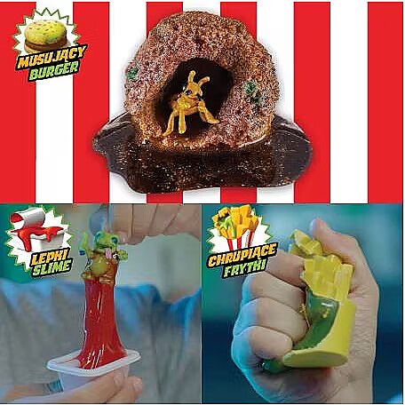 Description - Discover the most nasty and bizarre characters from the depths of the fast-food fryer. Each Terror Fried meal features terrifying mixes to get you mushy and squishy while you play. Who ordered the hideous box? Lots of layers to explore the disgusting fried bits. .....to a veritable horror show. The fast food kitchen is serving up some real abominations these days! 5 skeletal figures in 5 nasty mixes! Included are a sparkling nugget, crispy fries, sticky slime, stale slime, marshmallow ice cream sundae, marshmallow shake.
