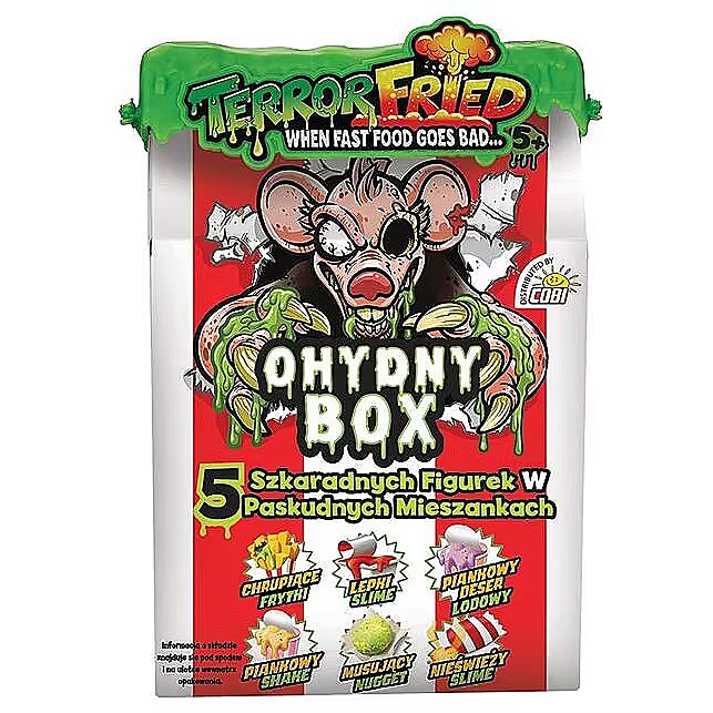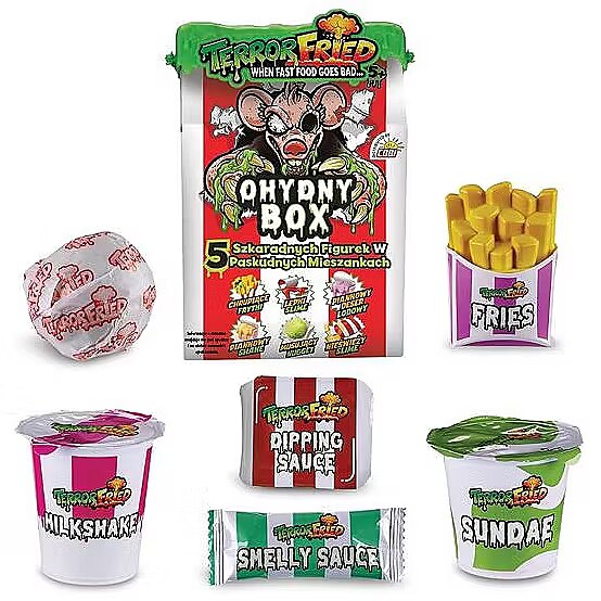Apraksts - Iepazīstiet vispretīgāko un dīvaināko personāžu no ātrās ēdināšanas fritēžu dziļumiem. Katrā Terror Fried maltītē ir šausminoši maisījumi, lai spēlēšanās laikā jūs kļūtu muskuļots un gļotains. Kurš pasūtīja šausmīgo kasti? Daudz slāņu, lai izpētītu pretīgos ceptos gabaliņus. .....to ir īsts šausmu šovs. Ātrās ēdināšanas virtuvē mūsdienās tiek pasniegtas īstas riebeklības! 5 skeleta figūriņas 5 pretīgos maisījumos! Komplektā ir dzirkstošs nēģis, kraukšķīgi frī kartupeļi, lipīgs gļots, staipīgs gļots, zefīru saldējuma nūdeles, zefīru kokteilis.