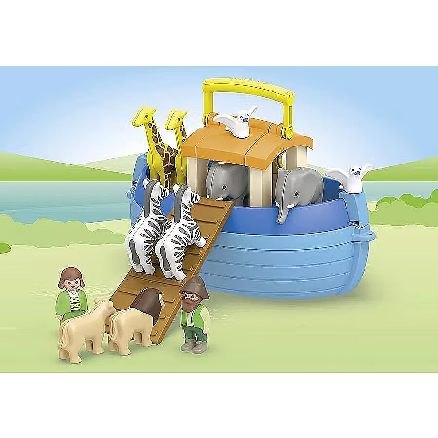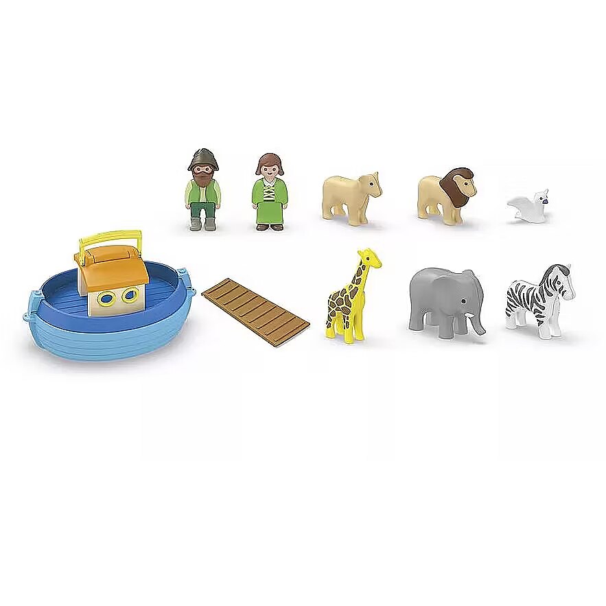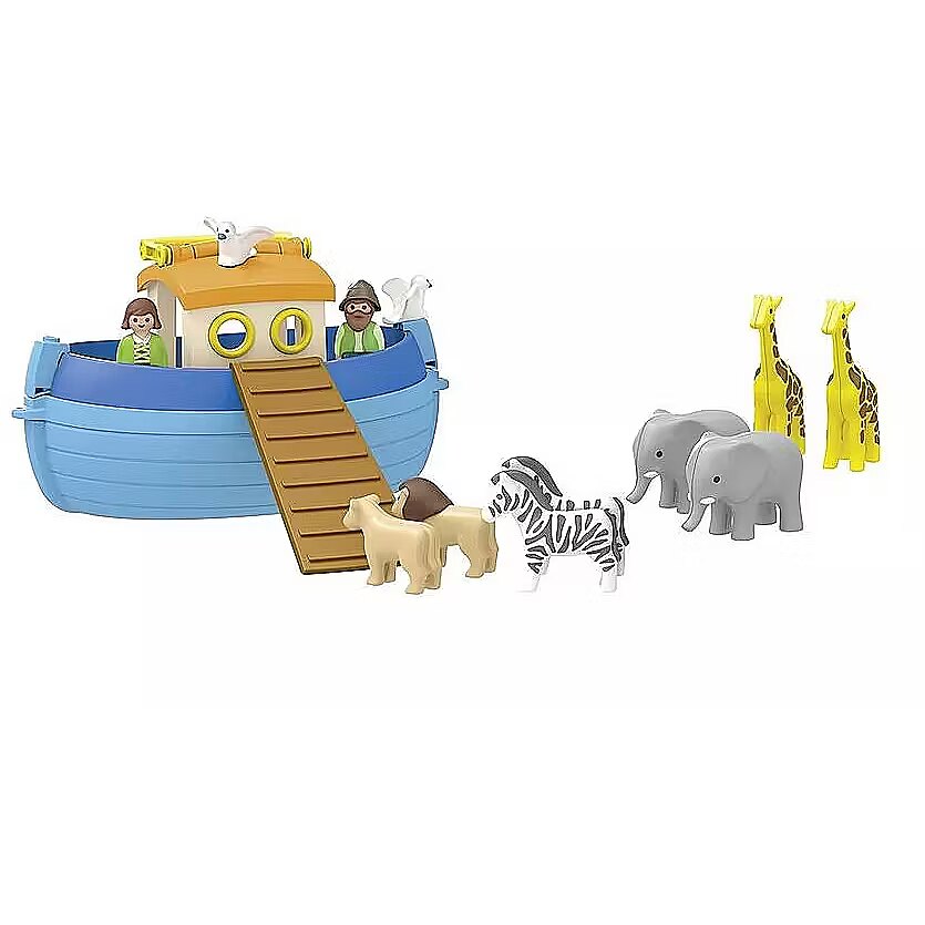 Accessories included - Figurki: 1 mężczyzna, 1 kobieta Zwierzęta: 2 słonie, 2 gołębie, 2 żyrafy, 2 zebry, 1 lwica, 1 lew Akcesoria: 1 arka, 1 rampa, 1 worek, 1 karmnik