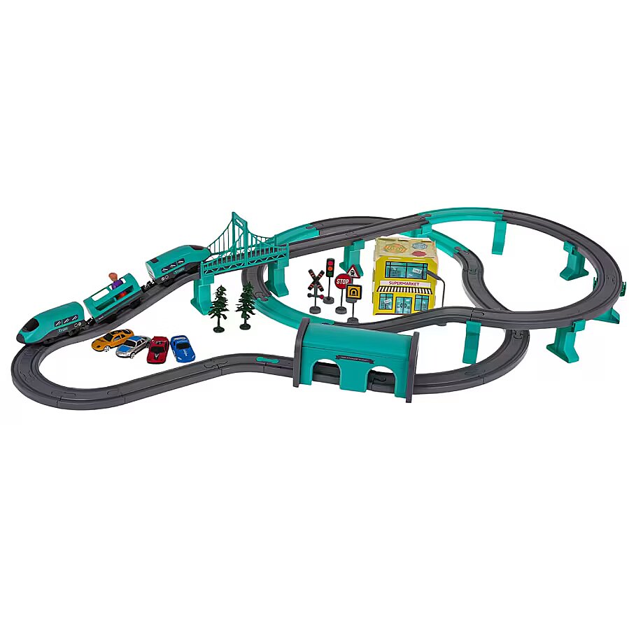 description_en - A richly equipped set of tracks with a train and accessories for children from 3 years of age. The set is made of the best quality plastic in vivid colors that attract the child's attention. The set includes 92 elements: construction parts of tracks, a train, a station, a bridge, a supermarket, road signs, as well as cars and a figure. The train is powered by 2 x AAA 1.5 V batteries (not included).