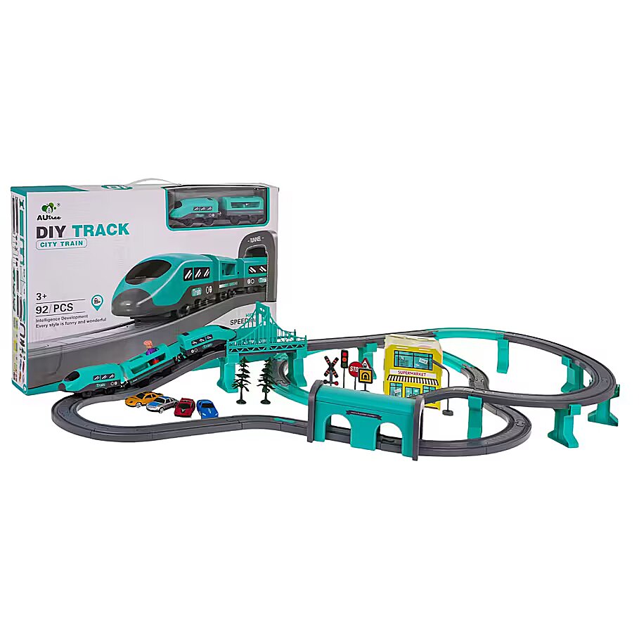 description_lv - Bagātīgi aprīkots sliežu ceļu komplekts ar vilcieniņu un piederumiem bērniem no 3 gadu vecuma. Komplekts ir izgatavots no vislabākās kvalitātes plastmasas košās krāsās, kas piesaista bērna uzmanību. Komplektā ir 92 elementi: sliežu ceļu konstruktīvās daļas, vilciens, stacija, tilts, lielveikals, ceļa zīmes, kā arī automašīnas un figūriņa. Vilcienu darbina 2 x AAA 1,5 V baterijas (nav iekļautas komplektā).