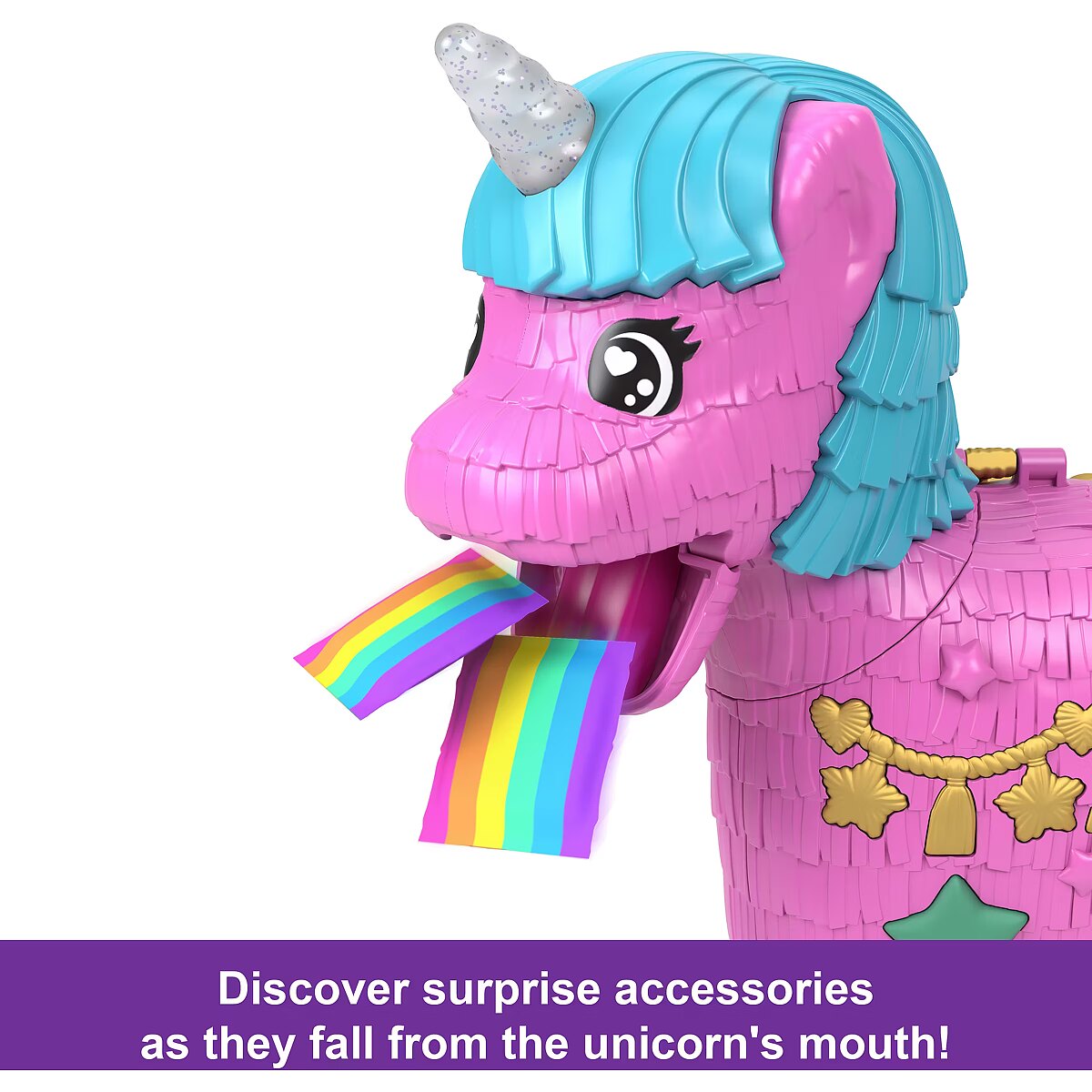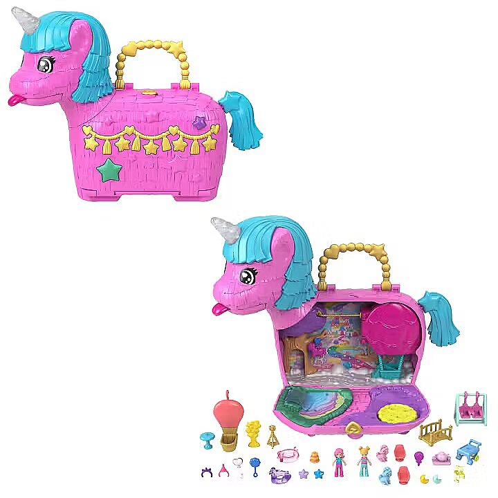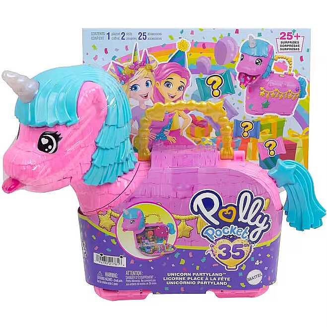 LongDesc - Celebrate Polly Pocket's 35th Anniversary with the Unicorn Partyland Playset. Get the celebration started with two micro dolls and 25+ accessories, including unicorn pets. This party is poppin', or should we say poopin''! With two unique ways to discover accessories, kids will love the rainbow 'puke' packed bags that fall out of the unicorn mouth and the 'poop' of surprise accessories when the tail is lifted! Surprises can be reloaded for repeat fun. The festive unicorn pinata exterior opens to a magical celebration where dolls can go for a ride in a hot air balloon, take turns on the swing, and share a slice of cake in the park. The party never ends with Polly Pocket and friends! Ideal for ages 4 years old and up, especially those who love rainbows, unicorns, and surprises. Colours and decorations may vary.