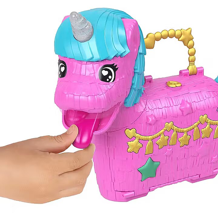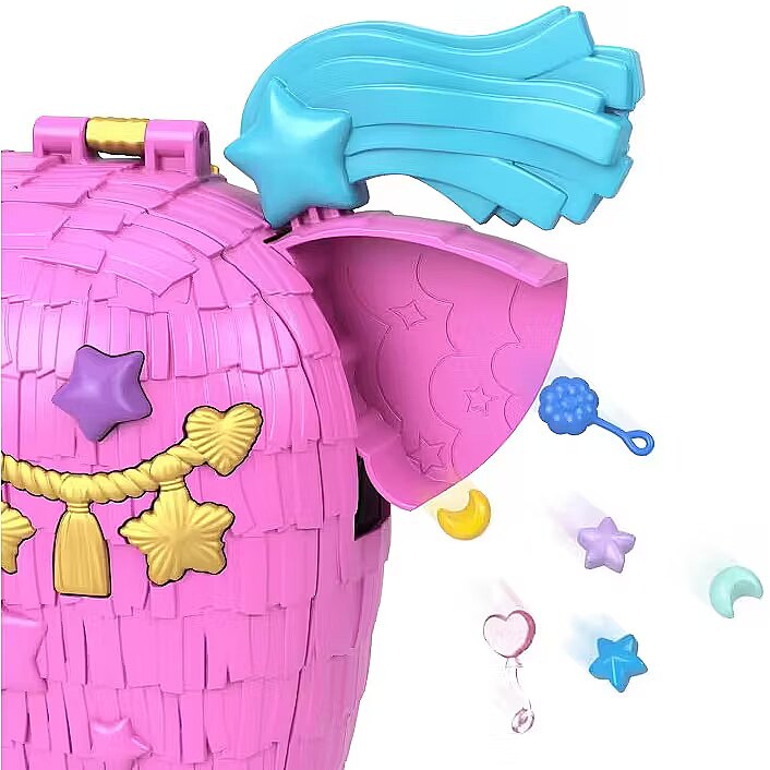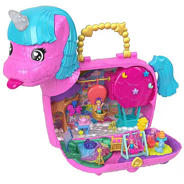 Celebrate Polly Pocket's 35th birthday with the Unicorn Surprise playset for kids! This set for kids aged 4 and up includes 2 micro dolls and over 25 adorable accessories, including adorable unicorn figurines. The fun is just getting started! There are two ways to discover surprises: rainbow bags fall from the unicorn's mouth, and lifting the tail spills out accessories. The surprises can be re-inserted for endless fun. Shaped like an adorable unicorn piata, the toy opens to reveal a magical party where the dolls can "fly" a balloon, alternate swings on a swing, and then enjoy a delicious "cake" in the park. The fun never ends with Polly Pocket and her friends! A great gift for kids aged 4 and up, especially those who love rainbows, unicorns, and surprises. Colors and decorations may vary. The Polly Pocket Unicorn Surprise 35th Birthday Set is full of incredible fun, making it a wonderful gift for kids aged 4 and up! Celebrate a Polly Pocket 35th birthday party with 2 micro dolls and 25 accessories, including animal figures. Let the fun begin! Rainbow bags fall from the unicorn's mouth, and lift the tail to reveal accessories. Surprises can be popped back in for endless fun. Open the adorable unicorn piata set and get the party started with balloons, party hats, a bouncy mini piata, and a "cake" to share with friends. Decorate the "flying" balloon with "jewels" and open the door to reveal additional play and storage space. The dolls can take turns swinging on the swing that moves back and forth, or ride the unicorn carousel. Drift away into the land of imagination at the waterfall, which opens to reveal storage space! The Unicorn Surprise 35th Birthday Toy Set is perfect for adult collectors and children aged 4 and up, who will love celebrating Polly Pocket's birthday!