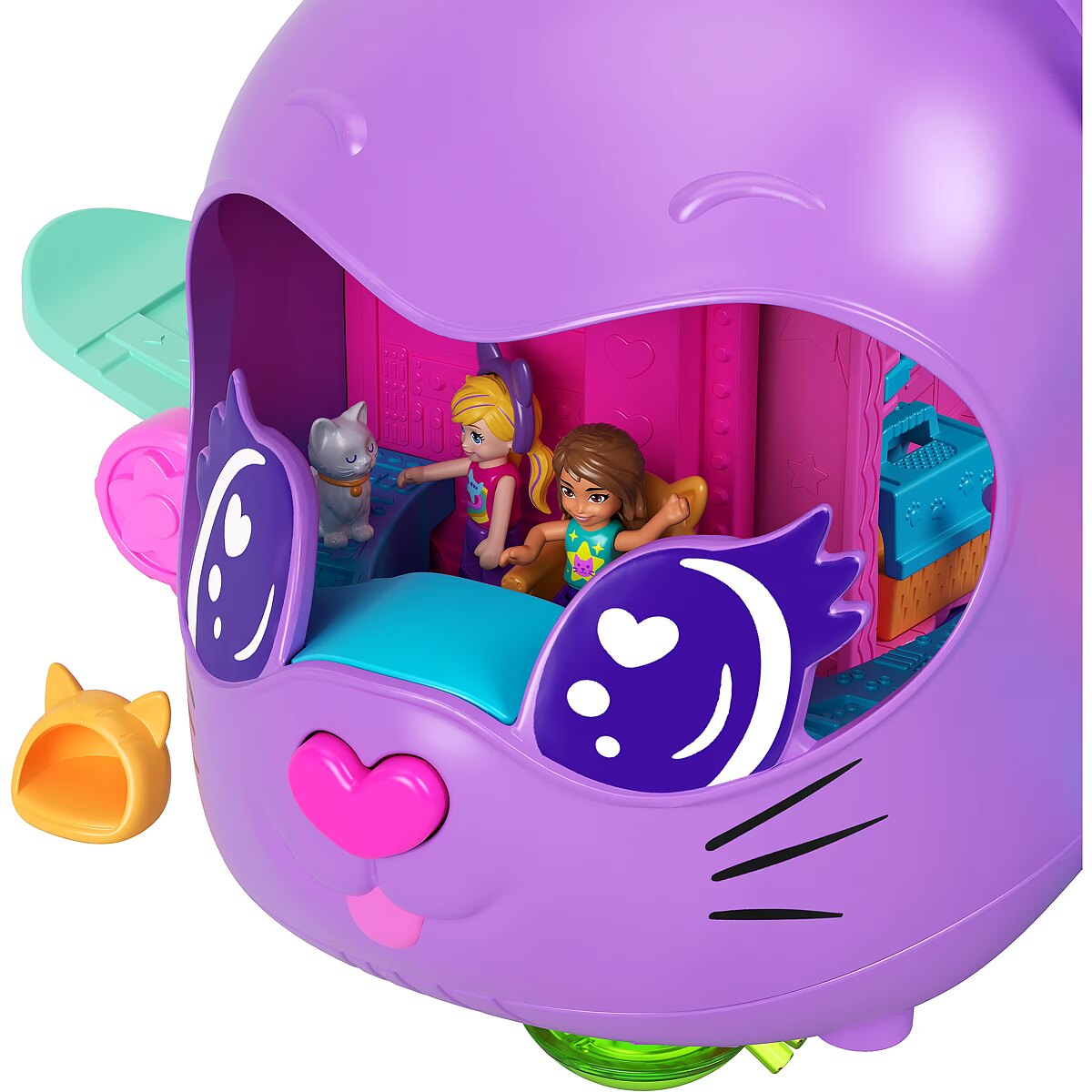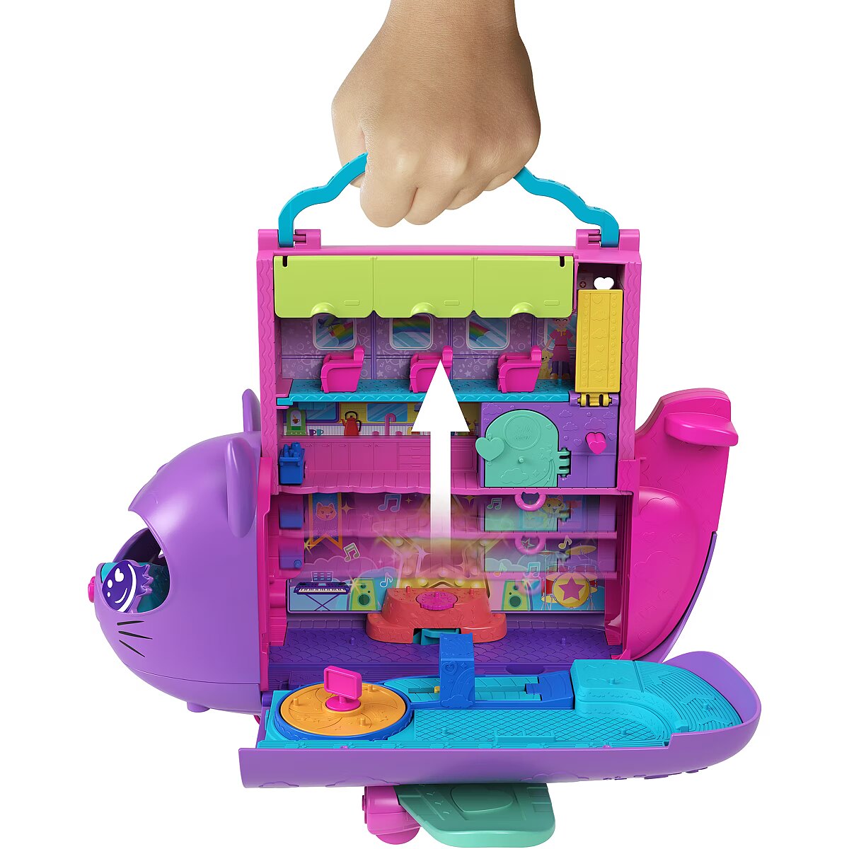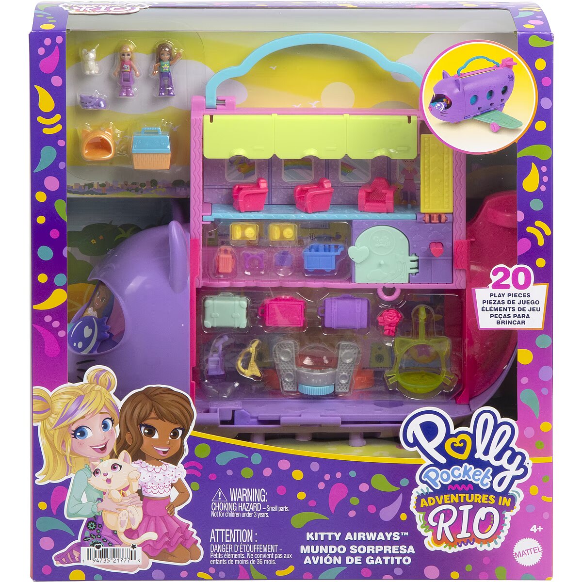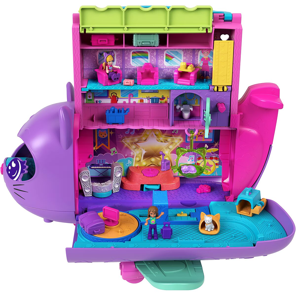 The Polly Pocket Cat Airplane is ready for takeoff and super-cool fun! Little travelers can soar on the wings of their imagination with this wonderful set featuring 2 micro dolls and 19 accessories. The adorable cat plane opens to reveal a multi-level interior. You can pilot the plane, sit in the passenger seat, or play both. Dolls can stow their luggage in the overhead compartments and take a window seat or use the bathroom. Fasten your seatbelts, it's time to soar! Serve "drinks" and "treats" from the cart, just like on a real plane. Turn your trip into a dance party the dolls and kitty have a rotating stage for performances! When you're done playing, fold the set up and take it anywhere. A perfect gift for kids aged 4 and up. Colors and decorative elements may vary. Time for super-cool fun! The Polly Pocket Cat Plane playset includes 2 micro dolls and 19 accessories, including a kitten figure, to make every trip special. Dolls can take the controls in the cockpit or be passengers on this multi-level plane. Role-play stowing luggage in the overhead bin, choosing a seat, and ordering a drink from the snack cart. Before the on-board performance, the dolls can use the bathroom. Put on the concert of a lifetime with a guitar solo or take the DJ booth! Kitty loves watching the performances from her swing. When the plane lands, head to the rotating conveyor belt to collect your luggage. Fold the set up to take it on the go. A great gift for kids aged 4 and up, especially those who love to travel.