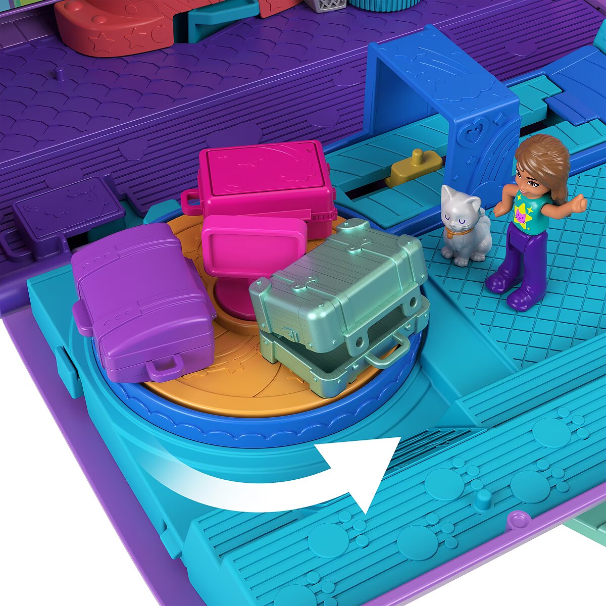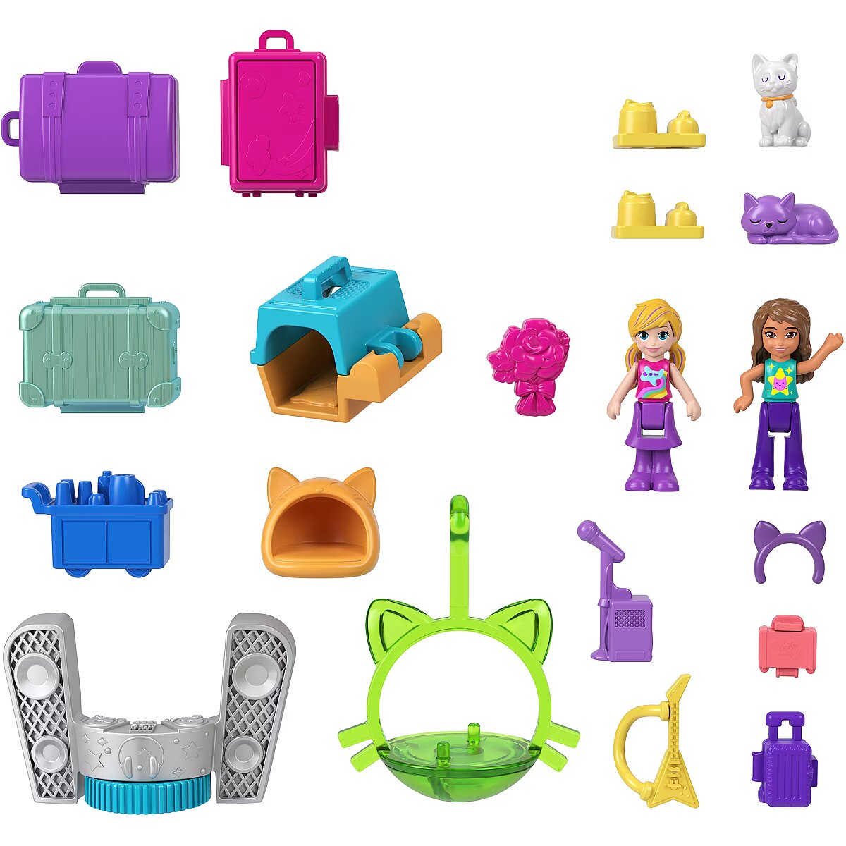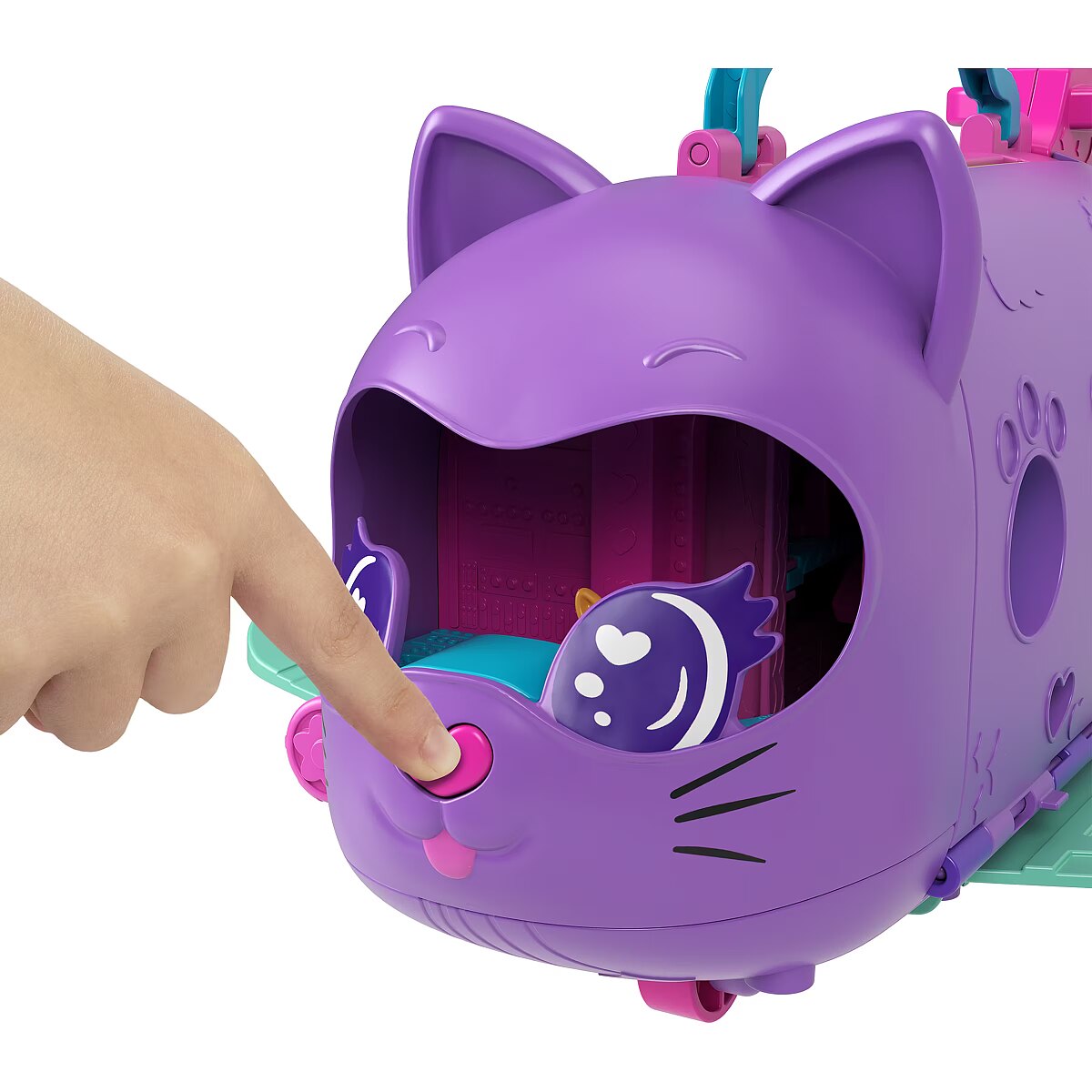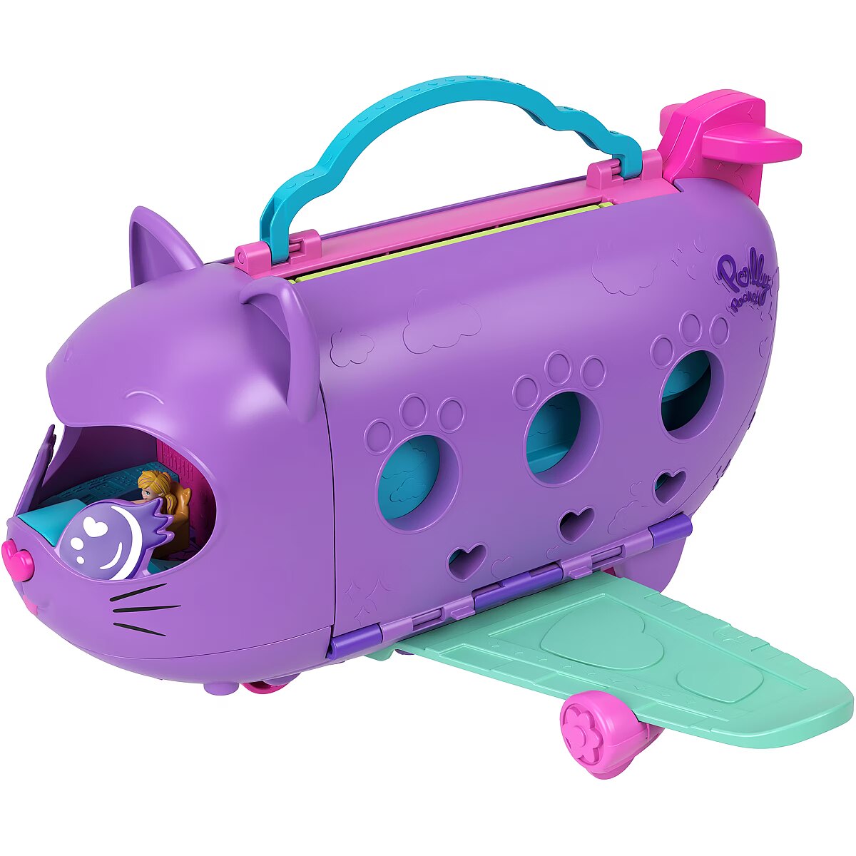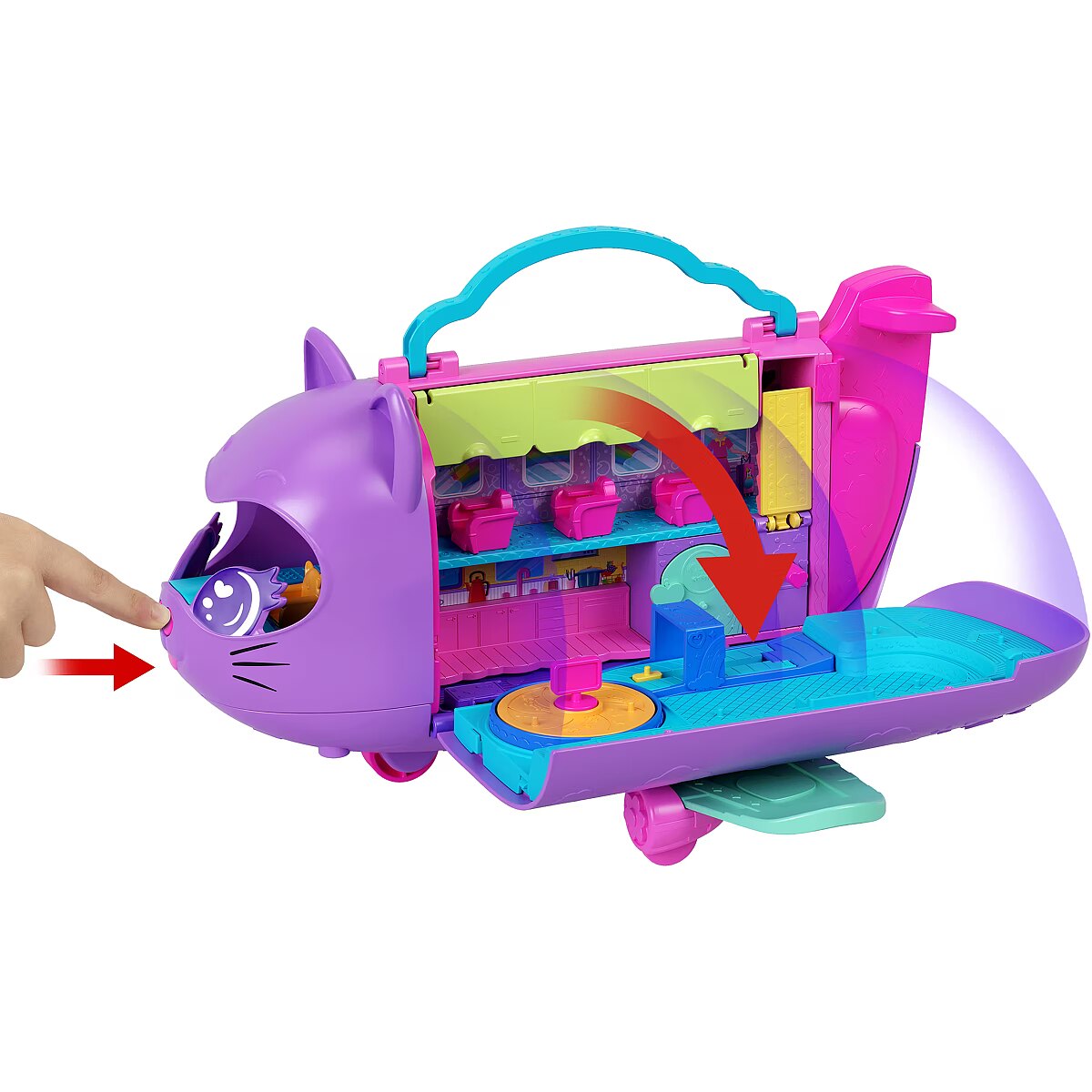 The Polly Pocket Cat Airplane is ready for takeoff and super-cool fun! Little travelers can soar on the wings of their imagination with this wonderful set featuring 2 micro dolls and 19 accessories. The adorable cat plane opens to reveal a multi-level interior. You can pilot the plane, sit in the passenger seat, or play both. Dolls can stow their luggage in the overhead compartments and take a window seat or use the bathroom. Fasten your seatbelts, it's time to soar! Serve "drinks" and "treats" from the cart, just like on a real plane. Turn your trip into a dance party the dolls and kitty have a rotating stage for performances! When you're done playing, fold the set up and take it anywhere. A perfect gift for kids aged 4 and up. Colors and decorative elements may vary. Time for super-cool fun! The Polly Pocket Cat Plane playset includes 2 micro dolls and 19 accessories, including a kitten figure, to make every trip special. Dolls can take the controls in the cockpit or be passengers on this multi-level plane. Role-play stowing luggage in the overhead bin, choosing a seat, and ordering a drink from the snack cart. Before the on-board performance, the dolls can use the bathroom. Put on the concert of a lifetime with a guitar solo or take the DJ booth! Kitty loves watching the performances from her swing. When the plane lands, head to the rotating conveyor belt to collect your luggage. Fold the set up to take it on the go. A great gift for kids aged 4 and up, especially those who love to travel.