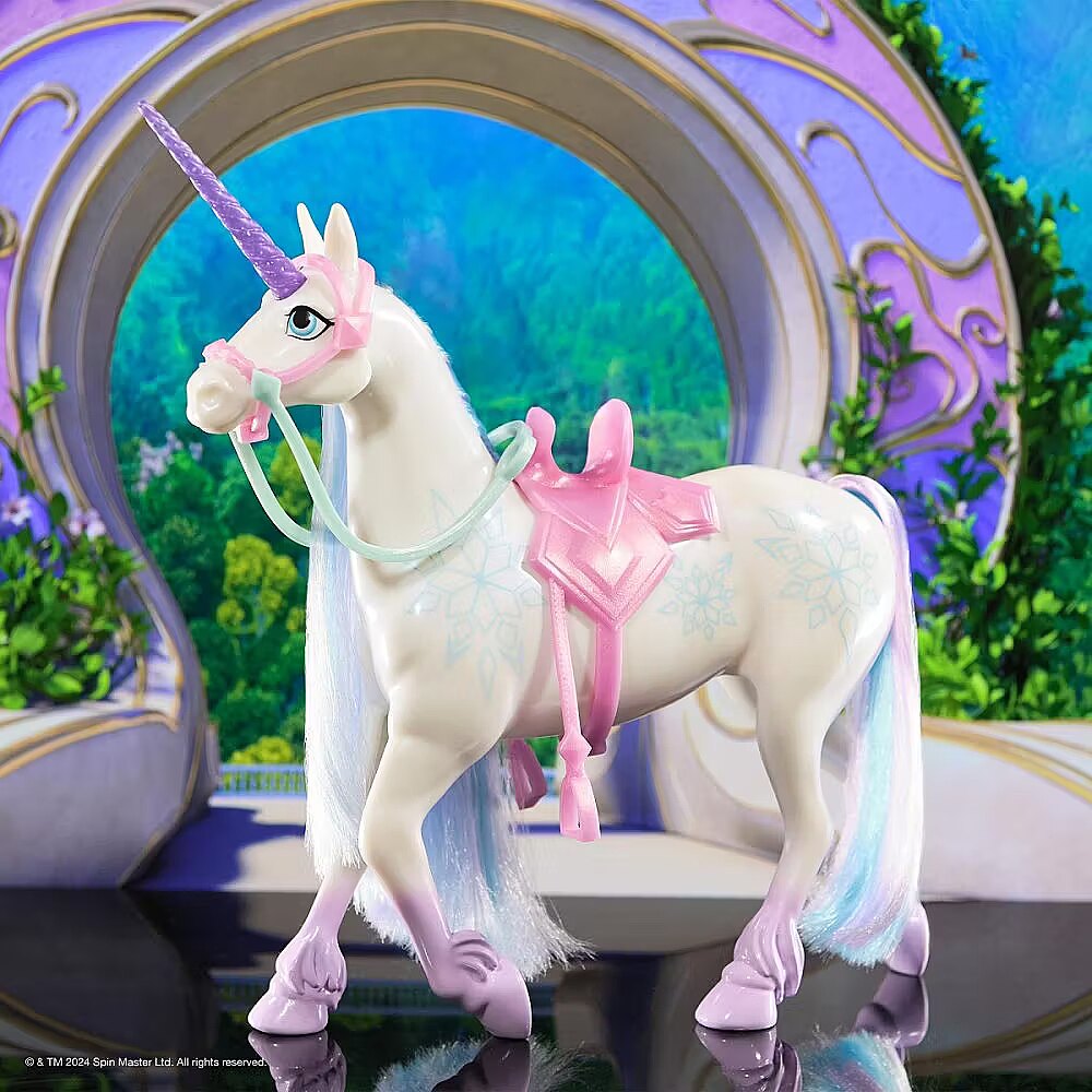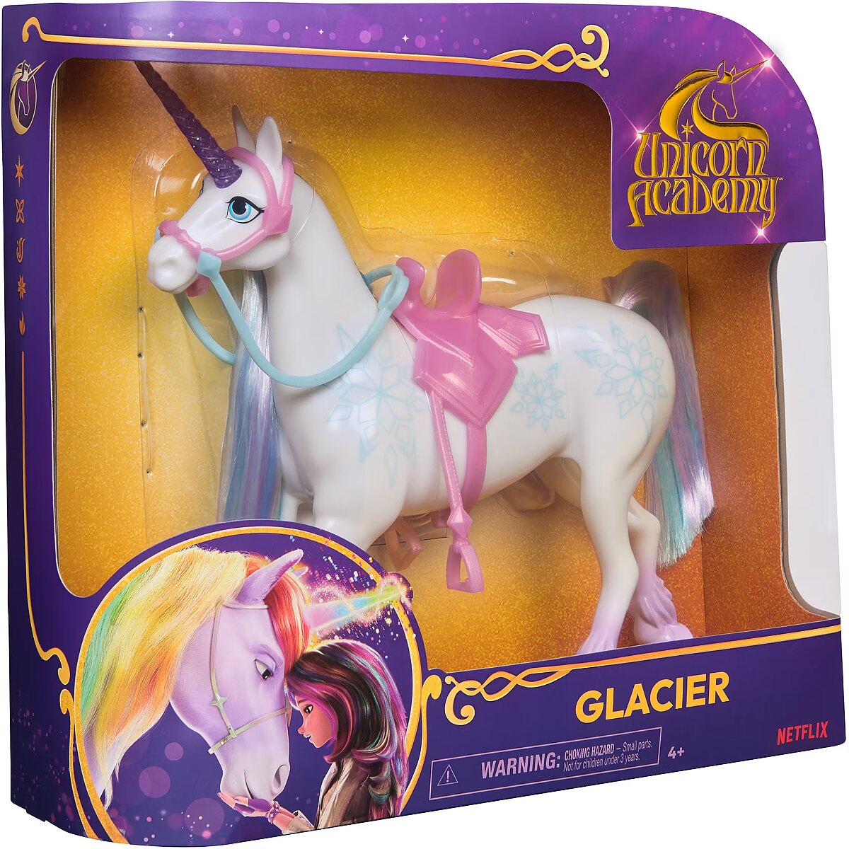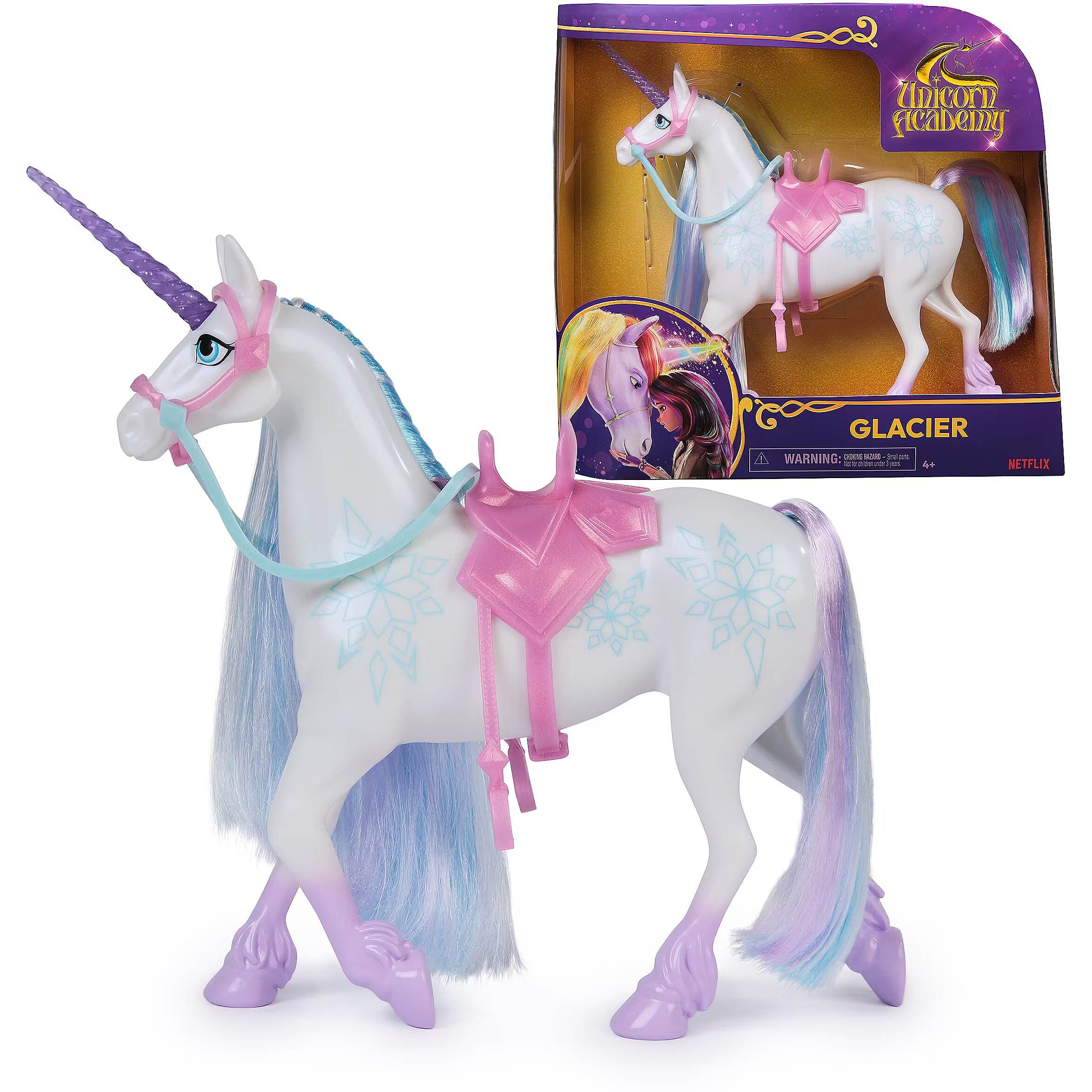 LongDesc - Complete your Unicorn Academy doll collection with Layla’s unicorn, Glacier. Inspired by the NETFLIX animated show and best-selling book series where friendship reins, this 11-inch unicorn toy brings headstrong, powerful Glacier to life. Beautifully detailed, Glacier features a pearlized body, snowflake Ice Magic markings on her side, a majestic glittery horn, colorful mane and tail, and removable bridle and saddle doll accessories for added play. Gently move Glacier’s head to bring out her personality and relive the magical bonding experience between unicorn and rider with Layla. Brush Glacier’s soft mane and tail with Layla’s styling tool (not included, sold separately with doll) and ride into adventure to protect Unicorn Island and its magic. For more ways to experience Unicorn Academy with your favorite characters, look for all of the rider dolls and their unicorns (each sold separately) and expand your world. The magical bonds between Unicorn Academy students and their unicorns will spark endless imaginative storytelling. For kids who enjoy unicorns and horse toys, dolls & accessories, doll house play, collectibles, plush toys and more, Unicorn Academy toys are fun birthday gifts for girls or gifts for any occasion. Bring home the magic of Unicorn Academy with Glacier.Includes: 1 Unicorn, 1 Removable Saddle, 1 Removable Bridle