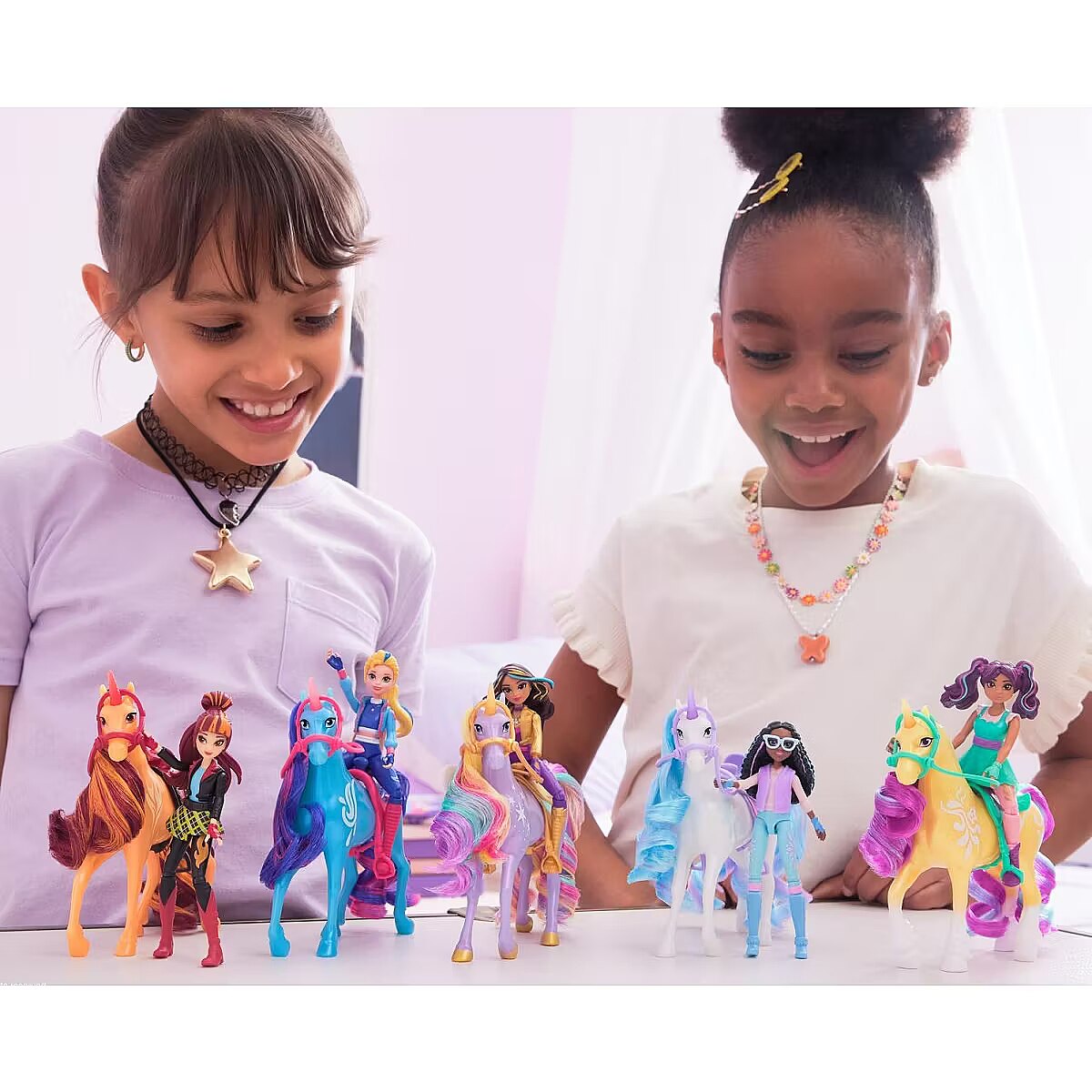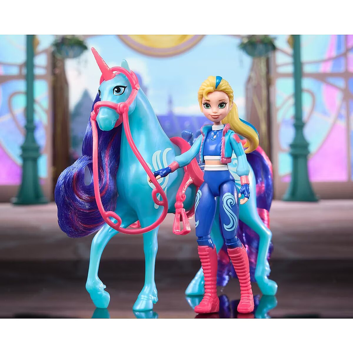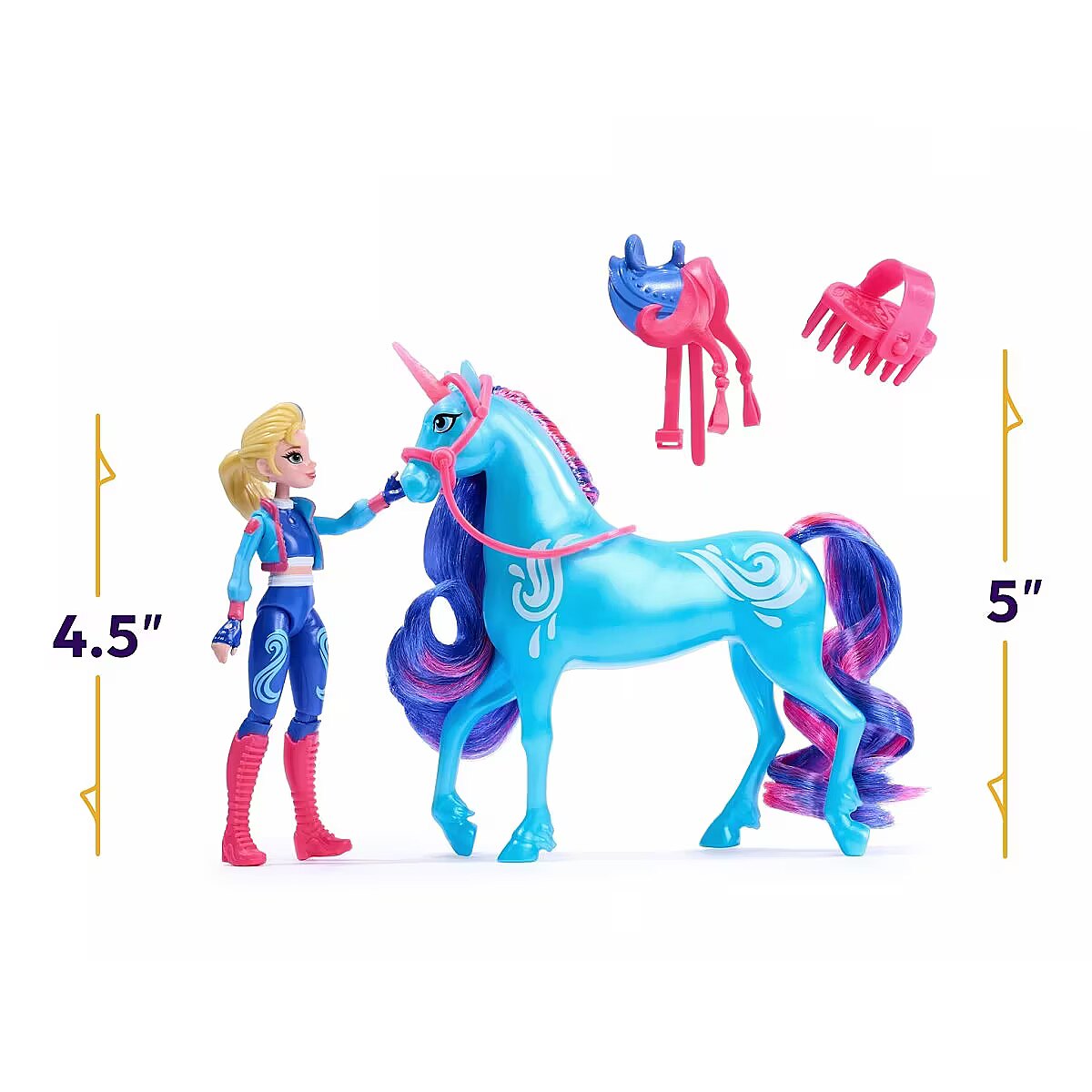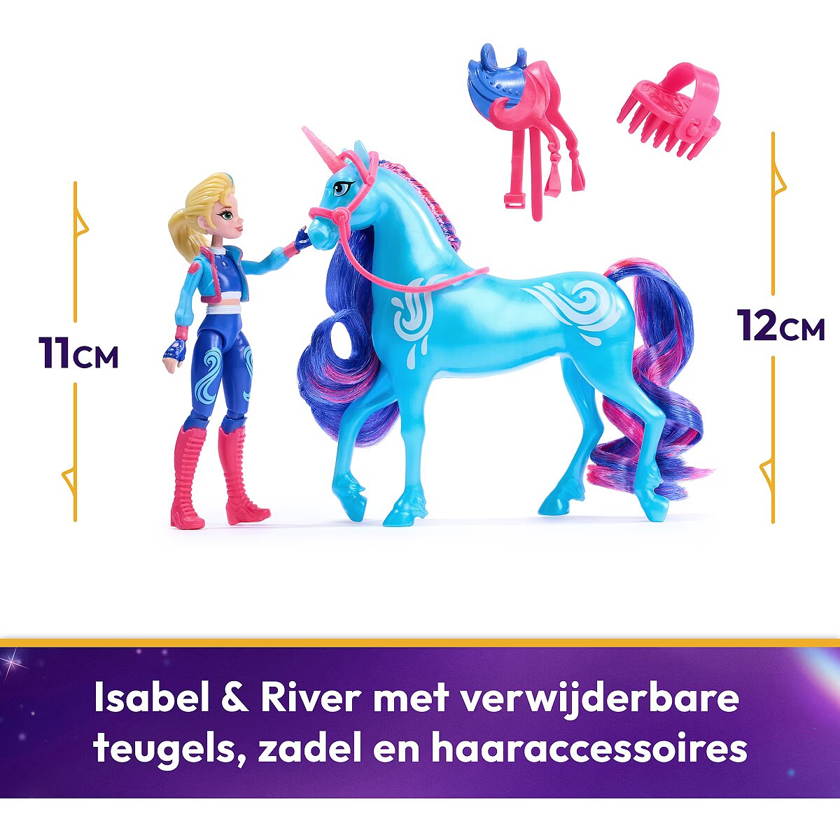 LongDesc - Celebrate the bond between rider and unicorn with the Unicorn Academy Isabel & River Set. Inspired by the NETFLIX animated show and best-selling book series where friendship reins, this set will spark endless imaginative storytelling. 4.5-inch Isabel features realistic true-to-show details and 7 points of articulation for dynamic poses. River stands at 5 inches tall, complimenting Isabel’s look with Water Magic markings and brushable blue and pink mane and tail (brush included). As you play, pose Isabel to sit on River and ride into adventure. With the removable bridle and saddle accessories, Isabel can securely stay in place on River. For more ways to experience Unicorn Academy with your favorite characters, look for the other small dolls, including Sophia, Ava, Layla, Valentina, and their unicorns (sets sold separately) and expand your world. For kids who enjoy unicorns and horse toys, dolls & accessories, doll house play, collectibles, plush toys and more, Unicorn Academy toys are fun birthday gifts for girls or gifts for any occasion. Experience enchanting Unicorn Academy adventures with the Isabel & River Set.Includes: 1 Doll, 1 Unicorn, 1 Removable Saddle, 1 Removable Bridle, 1 Hair Styling Tool
