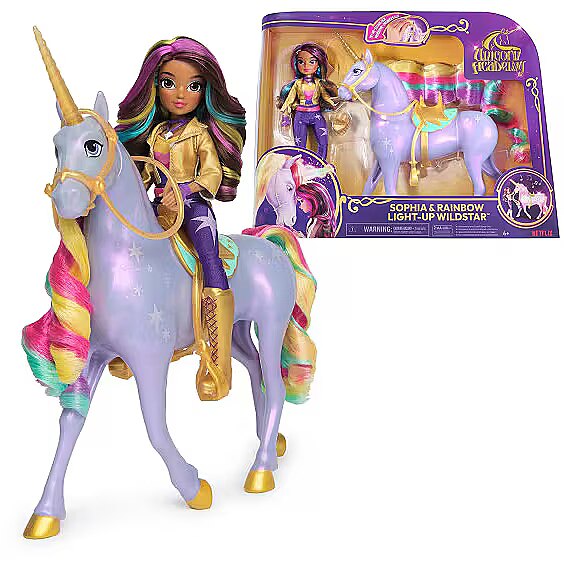 LongDesc - Celebrate the bond between rider and unicorn with the Unicorn Academy Sophia & Wildstar Set. Inspired by the NETFLIX animated show and best-selling book series where friendship reins, this set will spark endless imaginative storytelling. 4.5-inch Sophia features realistic true-to-show details and 7 points of articulation for dynamic poses. Wildstar stands at 5 inches tall, complimenting Sophia’s look with Light Magic markings and brushable rainbow mane and tail (brush included). As you play, pose Sophia to sit on Wildstar and ride into adventure. With the removable bridle and saddle accessories, Sophia can securely stay in place on Wildstar. For more ways to experience Unicorn Academy with your favorite characters, look for the other small dolls, including Ava, Layla, Isabel, Valentina, and their unicorns (sets sold separately) and expand your world. For kids who enjoy unicorns and horse toys, dolls & accessories, doll house play, collectibles, plush toys and more, Unicorn Academy toys are fun birthday gifts for girls or gifts for any occasion. Experience enchanting Unicorn Academy adventures with the Sophia & Wildstar Set.Includes: 1 Doll, 1 Unicorn, 1 Removable Saddle, 1 Removable Bridle, 1 Hair Styling Tool