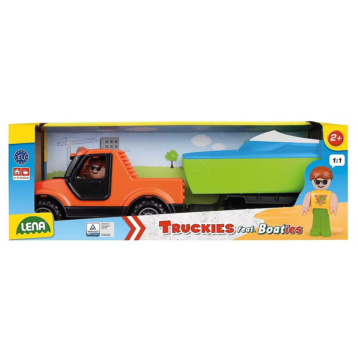 Description - Zestaw Truckies Pickup z przyczepą Zestaw składający się z pickupa Truckies, przyczepy do przewozu łodzi i żaglówki. Nadaje się do wszystkich łodzi. Osie ze stali ocynkowanej. Kabina, którą można otworzyć i się nią bawić. Zaczep przyczepy. Z figurką LENA. Nadaje się do stosowania wewnątrz i na zewnątrz.