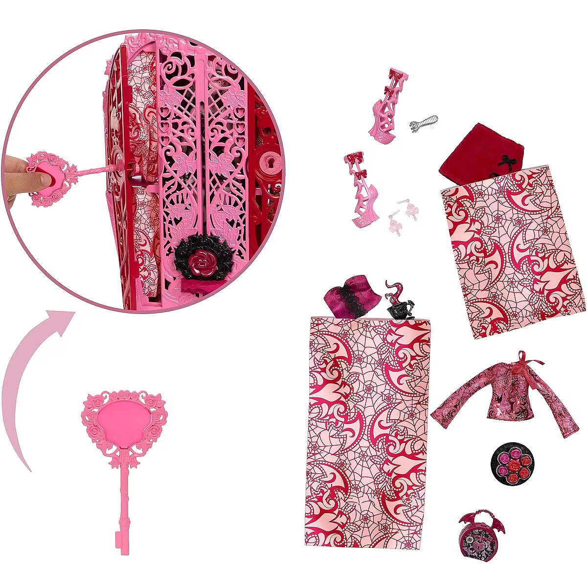 Packaging content - Packaging content - Includes 1 Draculaura doll, 1 closet with two doors, 1 key, 2 maps, 3 charms, 2 hangers, and assorted clothing and accessories. Doll cannot stand alone. Colours and decorations may vary.
